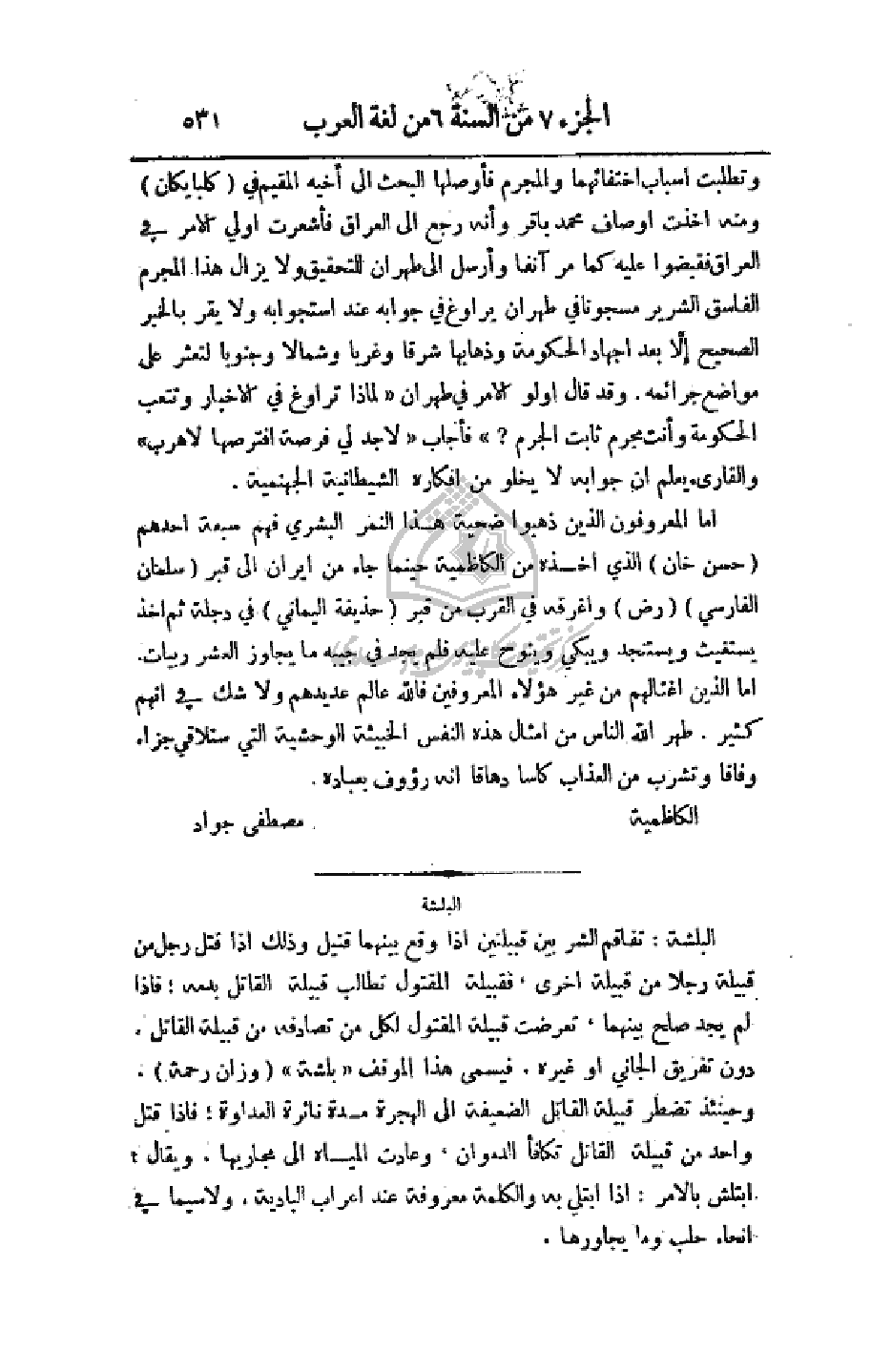 ن وتطلبت أسباب اختفائهما والمجرم فأوصلها البحث إلى أخيه المقيم في (كلبايكان) ومنه أخذت أوصاف محمد باقر وانه رجع إلى العراق فأشعرت أولي الأمر في العراق فقبضوا عليه كما آنفا وأرسل إلى طهران للتحقيق ولا يزال هذا المجرم الفاسق الشرير مسجونا في طهران يراوغ في جوابه عند استجوابه ولا يقر بالخبر الصحيح إلا بعد إجهاد الحكومة وذهابها شرقا وغربا وشمالا وجنوبا لتعثر على موضع جرائمه وقد قال أولو الأمر في طهران (لماذا تراوغ في الأخبار وتتعب الحكومة وأنت مجرم ثابت الجرم؟) فأجاب (لأجد لي فرصة افترصها لأهرب) والقارئ يعلم أن جوابه لا يخلو من أفكاره الشيطانية الجهنمية.