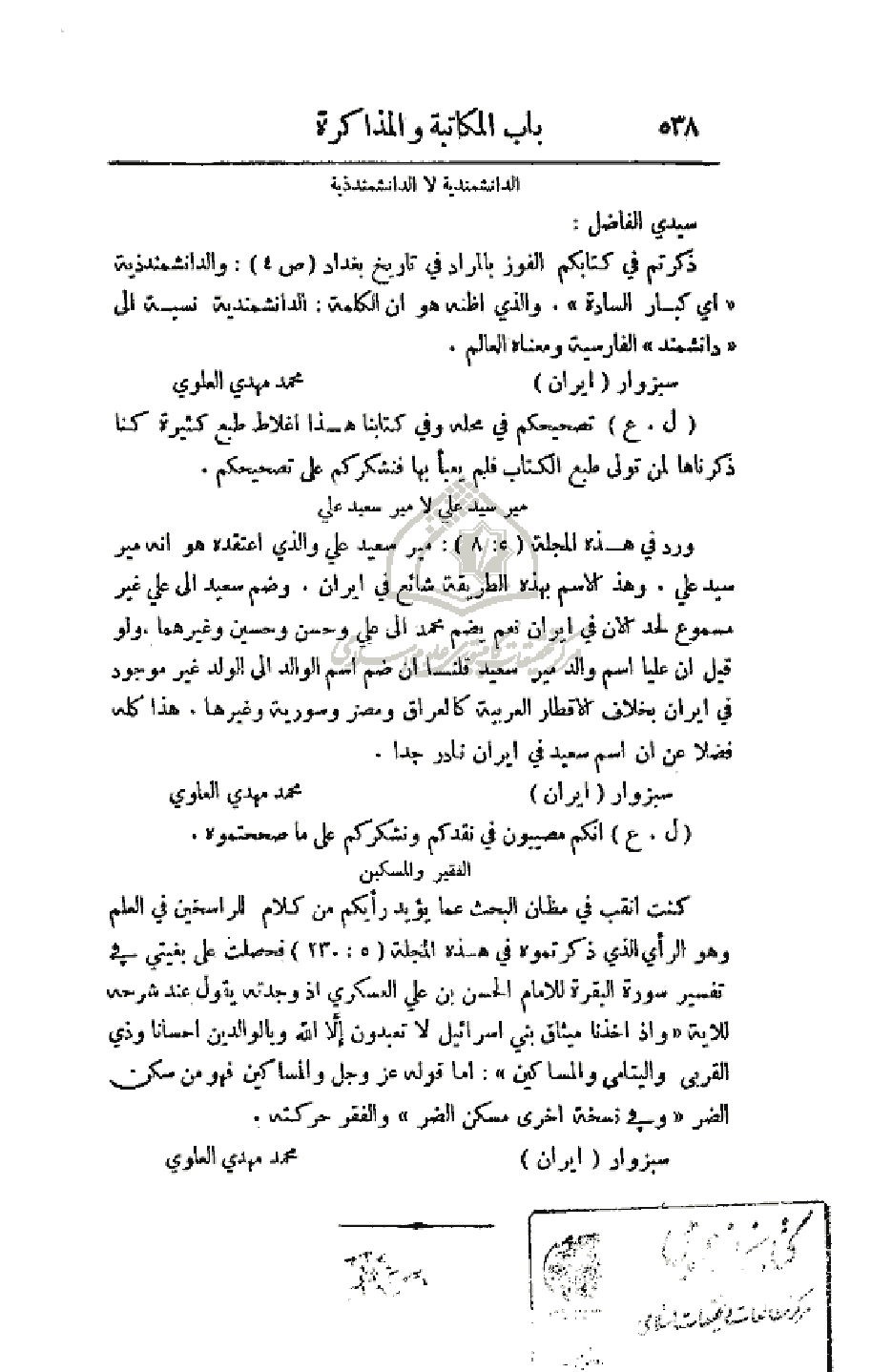ذكرتم في كتابكم الفوز بالمراد في تاريخ بغداد (ص 4): والدانشمندذية (أي كابر السادة). والذي أظنه هو أن الكلمة: الدانشمندية نسبة إلى (دانشمند) الفارسية ومعناه العالم.