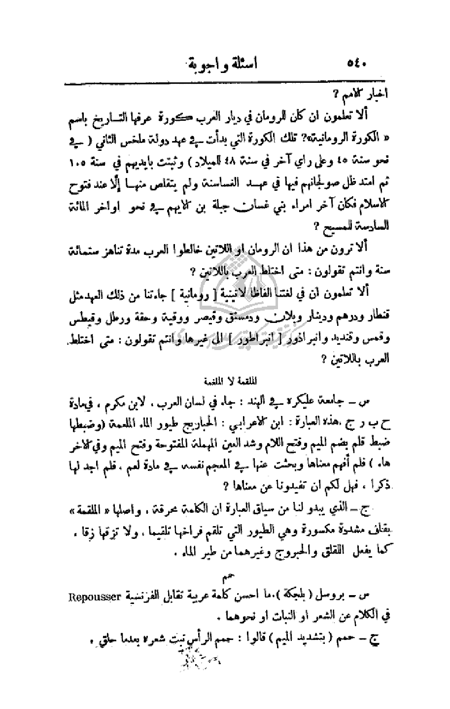 ألا تعلمون أن في لغتنا ألفاظا لاتينية (رومانية) جاءتنا من ذلك العهد مثل قنطار ودرهم ودينار وبلان ودمستق وقيصر ووقية وحقة ورطل وقيطس وقمس وقنديد وانبراذور (انبراطور) إلى غيرها وانتم تقولون: متى اختلط العرب باللاتين؟