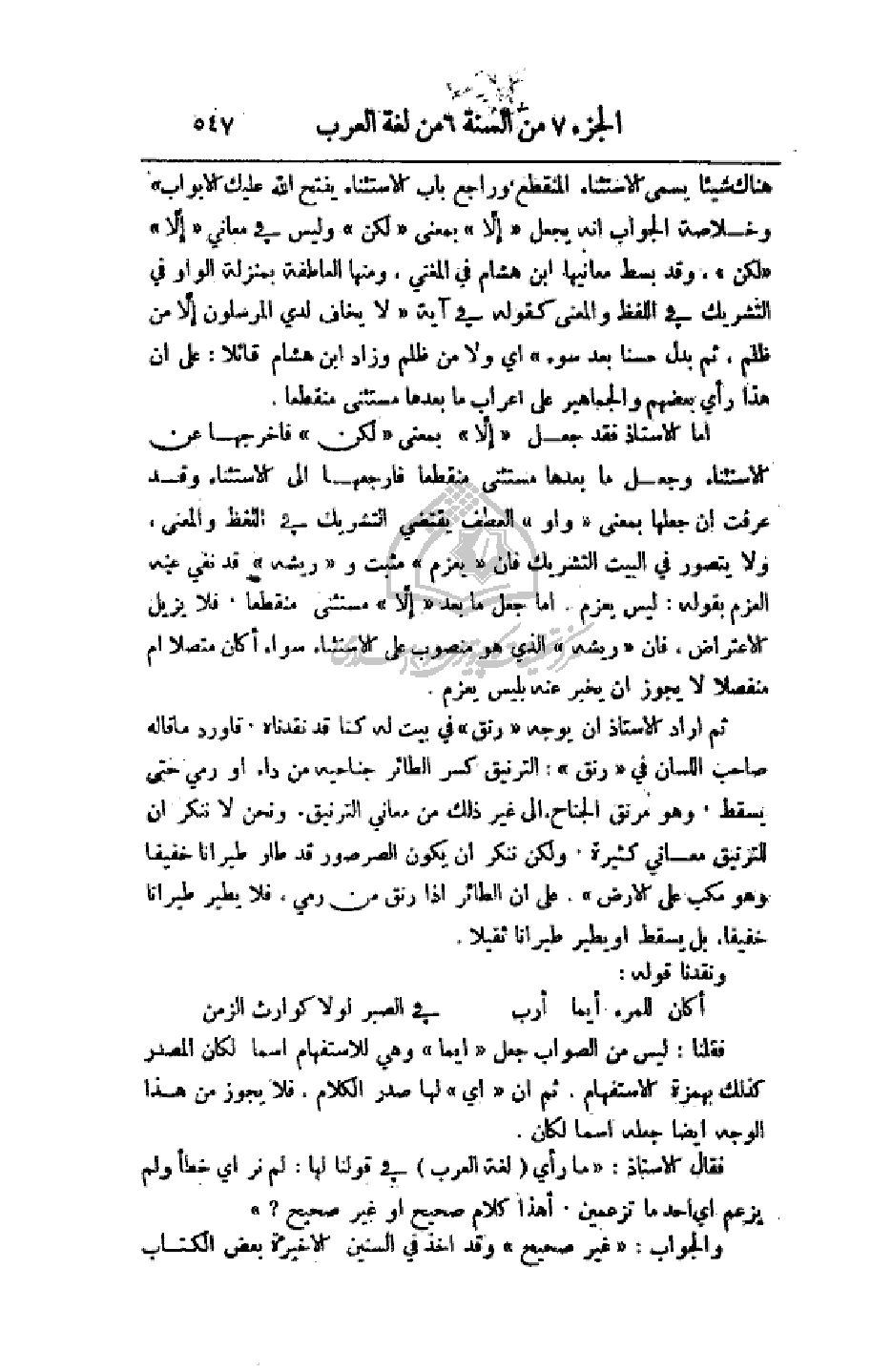 أما الأستاذ فقد جعل (إلا) بمعنى (لكن) فأخرجها عن الاستثناء وجعل ما بعدها مستثنى منقطعا فأرجعها إلى الاستثناء وقد عرفت أن جعلها بمعنى (واو) العطف يقتضي التشريك في اللفظ والمعنى، ولا يتصور في البيت التشريك فإن (يعزم) مثبت و (ريشه) قد نفي عنه العزم بقوله: ليس بعزم أما جعل ما بعد (إلا) مستثنى منقطعا، فلا يزيل الاعتراض، فإن (ريشه) الذي هو منصوب على الاستثناء سواء أكان متصلا أم منفصلا لا يجوز أن يخبر عنه بليس يعزم.