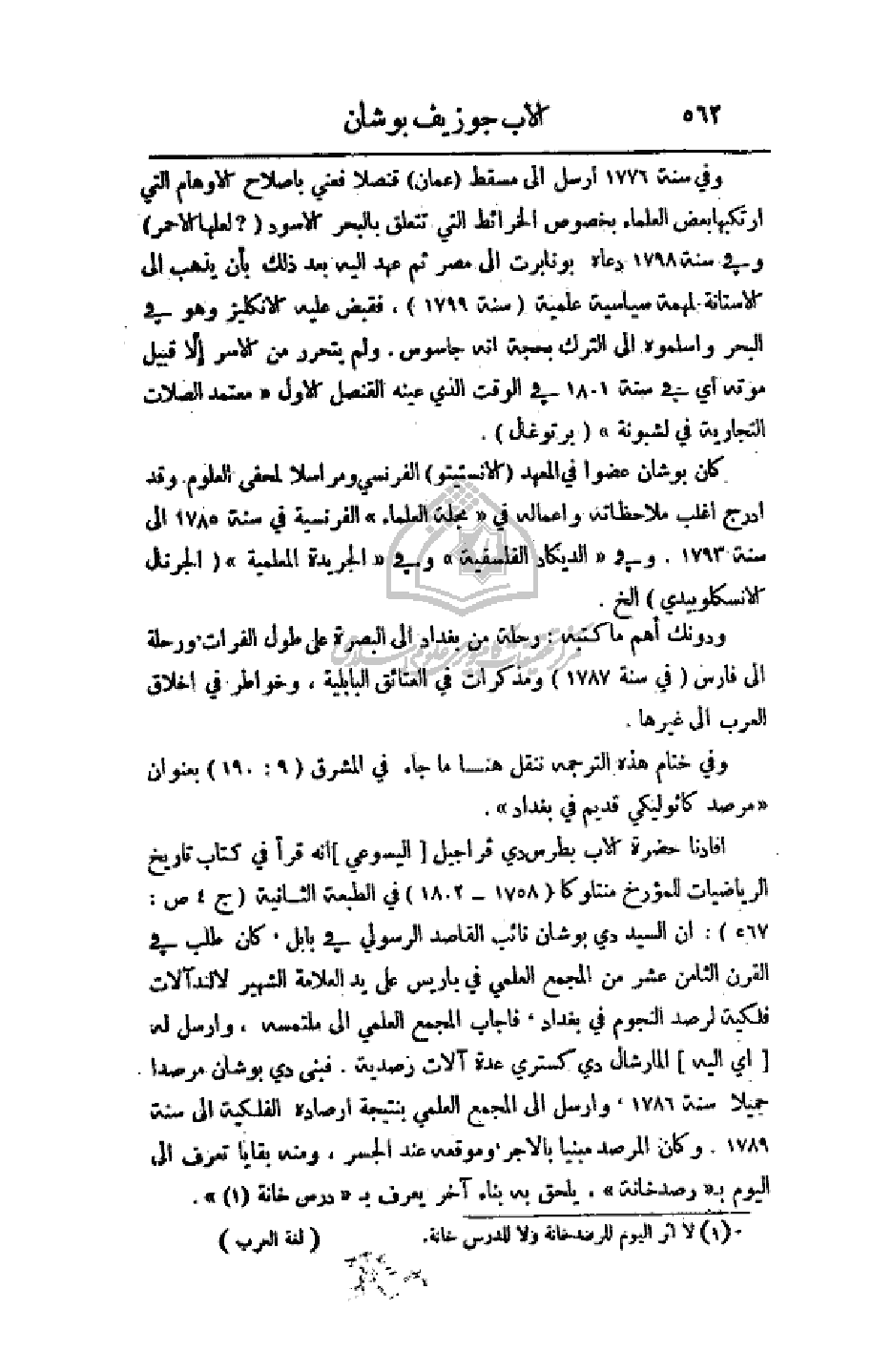 أفادنا حضرة الأب بطرس دي فراجيل (اليسوعي) إنه قرأ في كتاب تاريخ الرياضيات للمؤرخ منتلوكا (1758 - 1802) في الطبعة الثانية (ج 4 ص: 567): أن السيد دي بوشان نائب القاصد الرسولي في بابل، كان طلب في القرن الثامن عشر من المجمع العلمي في باريس على يد العلامة الشهير لالند آلات فلكية لرصد النجوم في بغداد، فأجاب المجمع العلمي إلى ملتمسه، وارسل له (أي إليه) المارشال دي كستري عدة آلات رصدية. فبنى دي بوشان مرصدا جميلا سنة 1786، وأرسل إلى المجمع العلمي بنتيجة أرصاده الفلكية إلى سنة 1789. وكان المرصد مبنيا بالآجر، وموقعه عند الجسر، ومنه بقايا تعرف إلى اليوم ب (رصد خانة)، يلحق به بناء آخر يعرف ب (درس خانة).
