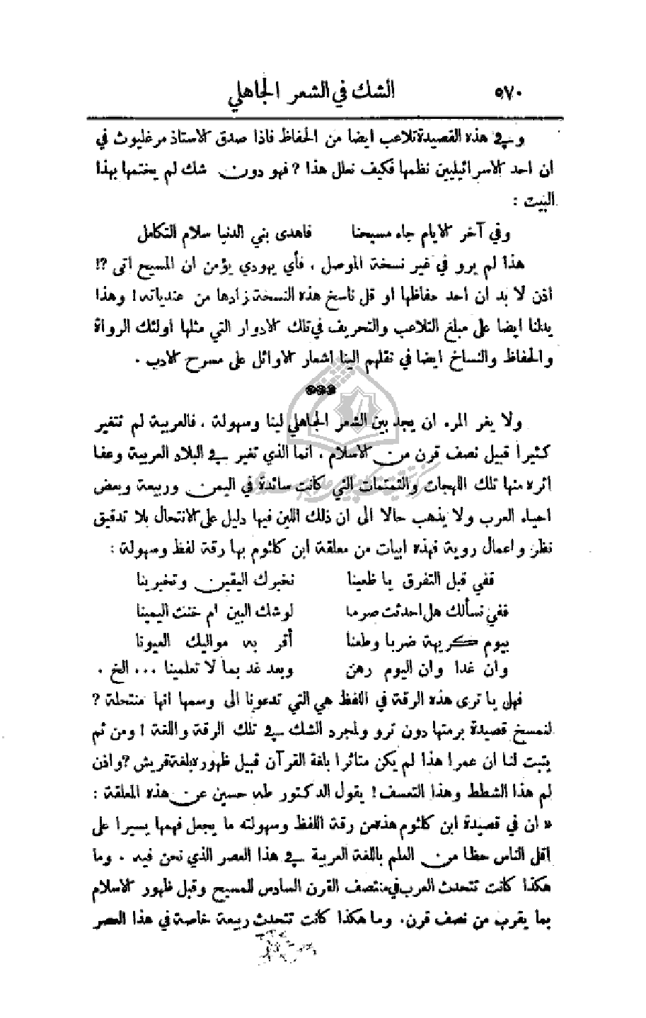 هذا لم يرو في غير نسخة الموصل، فأي يهودي يؤمن أن المسيح أتى؟! إذن لابد أن أحد حفاظها أو قل ناسخ هذه النسخة زادها من عندياته! وهذا يدلنا أيضاً على مبلغ التلاعب والتحريف في تلك الأدوار التي مثلها أولئك الرواة والحفاظ والنساخ أيضاً في نقلهم إلينا أشعار الأوائل على مسرح الأدب.