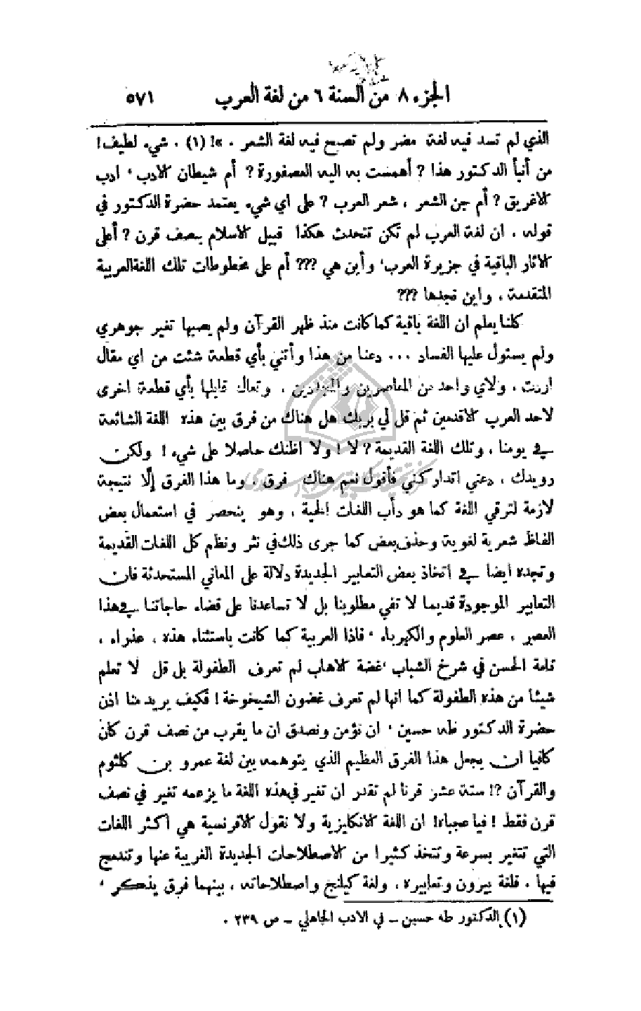 الذي لم تسد فيه لغة مصر ولم تصبح فيه لغة الشعر)!. شيء لطيف! من أنبأ الدكتور هذا؟ أهمست به إليه العصفورة؟ أم شيطان الأدب، أدب الإغريق؟ أم جن الشعر، شعر العرب؟ على أي شيء يعتمد حضرة الدكتور في قوله، أن لغة العرب لم تكن تتحدث هكذا قبيل الإسلام بنصف قرن؟ أعلى الآثار الباقية في جزيرة العرب، وأين هي؟؟؟ أم على مخطوطات تلك اللغة العربية المتقدمة، وأين نجدها؟؟؟