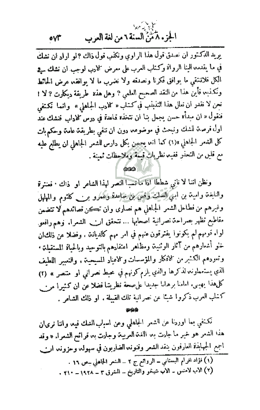 ونظن أننا لا نأتي شططا إذا ما نسبنا النصر لهذا الشاعر أو ذاك، فعنترة والنابغة وأمية بن أبي الصلت وقيس بن ساعدة وعمرو بن كلثوم والمهلهل وغيرهم من فطاحل الشعر الجاهلي هم نصارى وإن تكن قصائدهم لا تتضمن مقاطيع تظهر بصراحة نصرانية أصحابها. . . نتحقق أن الشعراء وهم رافعو لواء قومهم لم يكنوا يفترقون عنهم في أمر مهم كالديانة، وفضلا عن ذلك أن خلو أشعارهم من آثار الوثنية ومظاهر اعتقادهم بالتوحيد وبالحياة المستقبلية، وتعودهم الكثير من الأفكار والمؤسسات والأعياد المسيحية، والتعبير اللطيف الذي يستعملونه لذكرها والذي يلزم كونهم في محيط نصراني أو متنصر) كل هذا يهيئ أمامنا برهانا جديدا على صحة نظريتنا فضلا عن أن كثيرا من كتاب العرب ذكروا شيئا عن نصرانية تلك القبيلة، أو ذلك الشاعر.