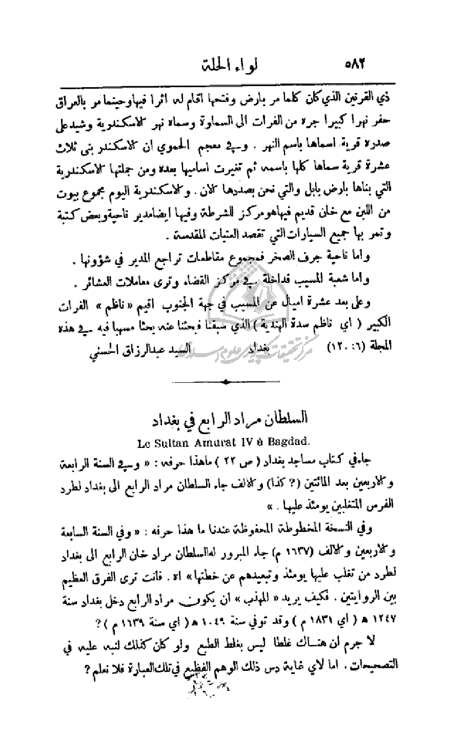 وفي النسخة المخطوطة المحفوظة عندنا ما هذا حرفه: (وفي السنة السابعة والأربعين والألف (1637م) جاء المبرور له السلطان مراد خان الرابع إلى بغداد لطرد من تغلب عليها يومئذ وتبعيدهم عن خطتها) أهـ. فأنت ترى الفرق العظيم بين الروايتين. فكيف يريد (المهذب) أن يكون مراد الرابع دخل بغداد سنة 1247هـ (أي 1831م) وقد توفي سنة 1049هـ (أي سنة 1639م)؟