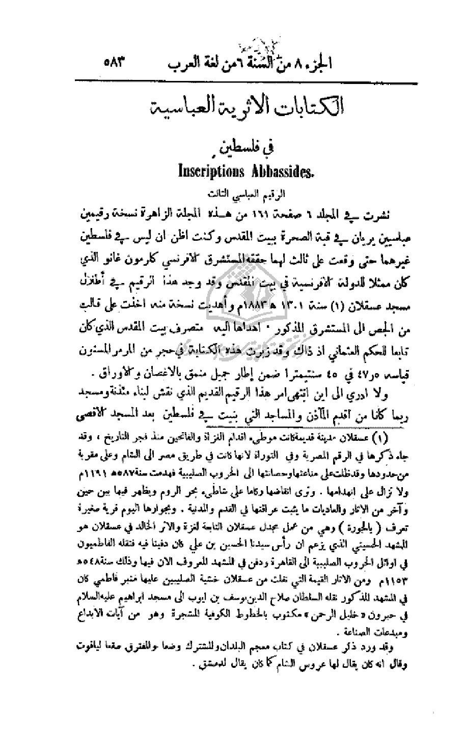 نشرت في المجلد 6 صفحة 161 من هذه المجلة الزاهرة نسخة رقيمين عباسيين يريان في قبة الصخرة ببيت المقدس وكنت أظن أن ليس في فلسطين غيرهما حتى وقعت على ثالث لهما حققه المستشرق الفرنسي كارمون غانو الذي كان ممثلا للدولة الفرنسية في بيت المقدس وقد جد هذا الرقيم في أطلال مسجد عسقلان سنة 1301هـ 1883م وأهديت نسخة منه أخذت على قالب من الجص إلى المستشرق المذكور، أهداها إليه متصرف بيت المقدس الذي كان تابعا للحكم العثماني إذ ذاك وقد زبرت هذه الكتابة في حجر من المرمر المسنون قياسه 47. 5 في 45 سنتمترا ضمن إطار جميل منمق بالأغصان والأوراق.