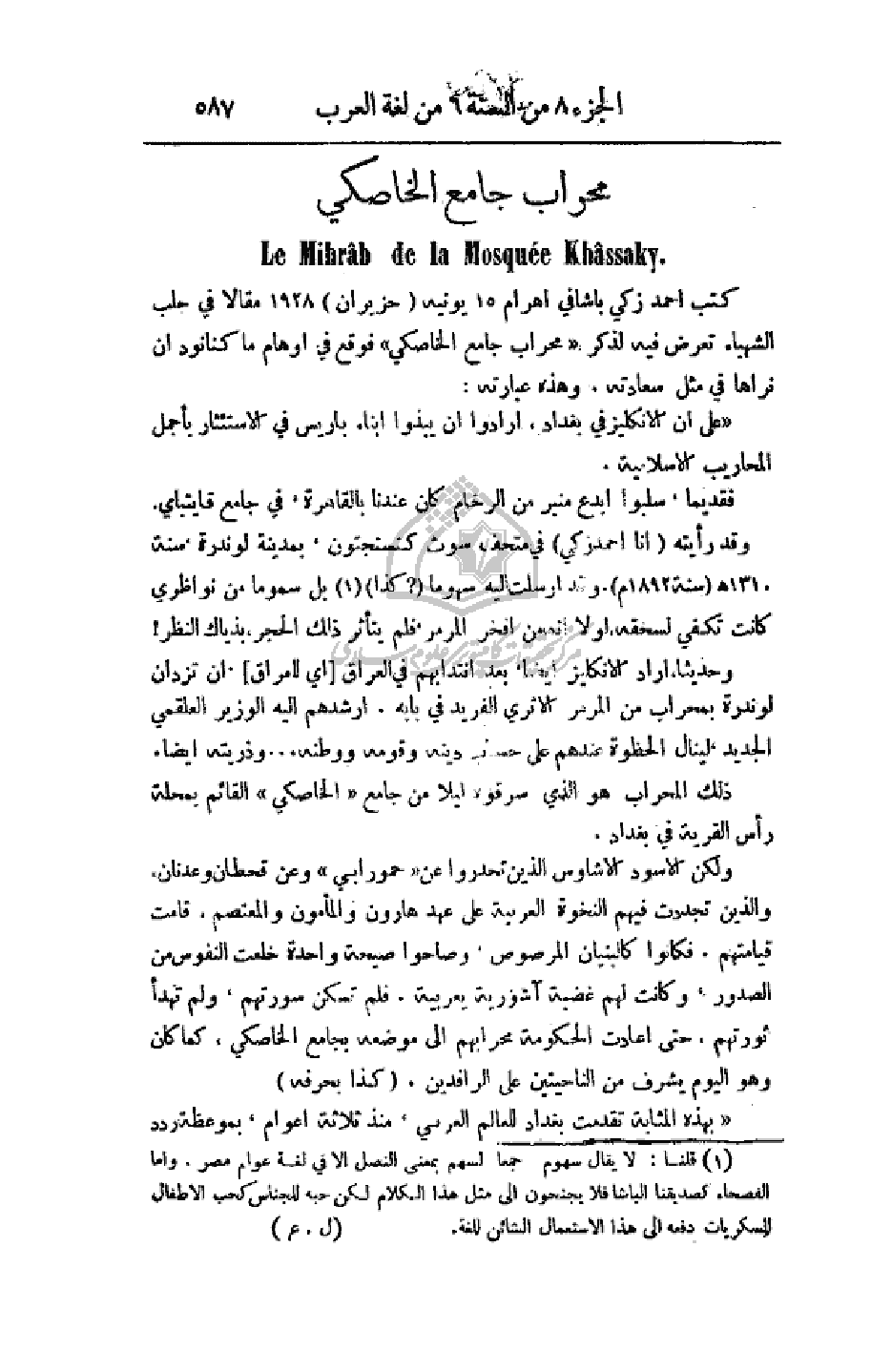 (على أن الإنكليز في بغداد، أرادوا أن يبذوا أبناء باريس في الاستئثار بأجمل المحاريب الإسلامية.