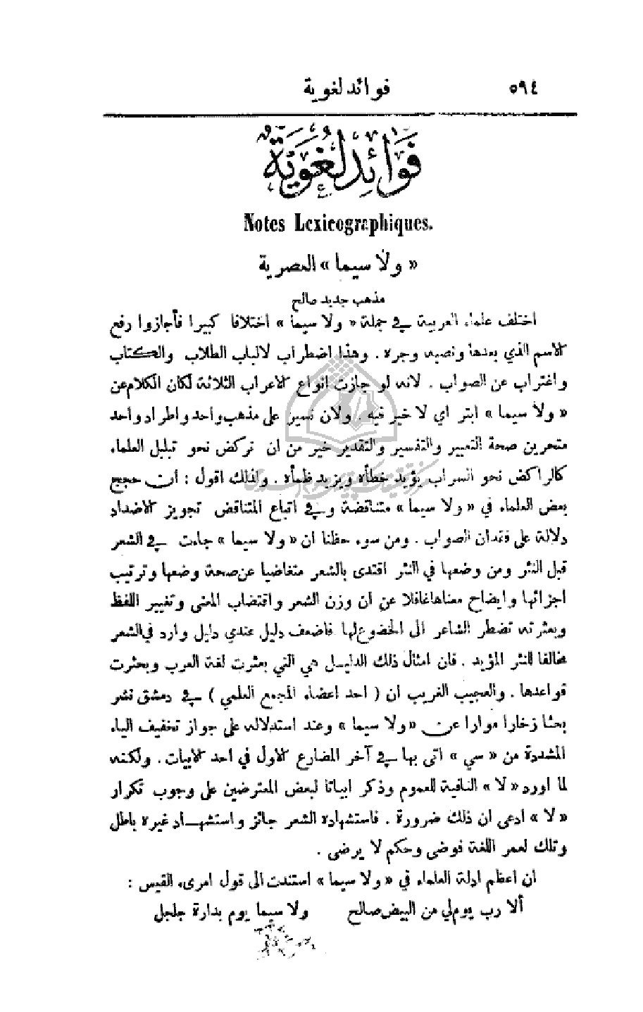 اختلف علماء العربية في جملة (ولاسيما) اختلافا كبيرا فأجازوا رفع الاسم الذي بعدها ونصبه وجره. وهذا اضطراب لألباب الطلاب والكتاب واغتراب عن الصواب. لأنه لو جازت أنواع الإعراب الثلاثة لكان الكلام عن (ولاسيما) لبتر أي لا خير فيه. ولان نسير على مذهب واحد واطراد واحد متحرين صحة التعبير والتفسير والتقدير خير من أن نركض نحو تبلبل العلماء كالراكض نحو السراب يؤيد خطأه ويزيد ظمأه. ولذلك أقول: أن حجج بعض العلماء في (ولاسيما) متناقضة وفي اتباع المتناقض تجويز الأضداد دلالة على فقدان الصواب. ومن سوء حظنا أن (ولاسيما) جاءت في الشعر قبل النثر ومن وضعها في النثر اقتدى بالشعر متغاضيا عن صحة وضعها وترتيب أجزائها وإيضاح معناها غافلا عن أن وزن الشعر واقتضاب المعنى وتغيير اللفظ وبعثرته تضطر الشاعر إلى الخضوع لها، فأضعف دليل عندي وارد في الشعر مخالفا للنثر المؤيد. فإن أمثال ذلك الدليل هي التي بعثرت لغة العرب وبحثرت قواعدها. والعجيب الغريب أن (أحد أخطاء المجمع العلمي) في دمشق نشر بحثا زخارا موارا عن (ولاسيما) وعند استدلاله على جواز تخفيف الياء المشددة من (سي) أتى بها في آخر المضارع الأول في أحد الأبيات. ولكنه لما أورد (لا) النافية للعموم وذكر أبياتا لبعض المعترضين على وجوب تكرار (لا) أدعى أن ذلك ضرورة. فاستشهاده الشعر جائز واستشهاد غيره باطل وتلك لعمر اللغة فوضى وحكم لا يرضى.
