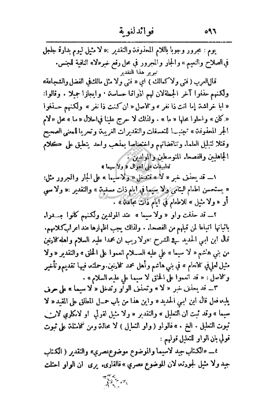 3 - قد يحذف خبر (لا) وتحذف الواو وتدخل (لاسيما) على حرف يليه فعل قال ابن أبي الحديد (وأين هذا من باب حمل المطلق على المقيد (لاسيما) وقد ثبت أن التعليل) والتقدير (ولا مثيل لقولي أو لإنكاري لأن ثبوت التعليل، الخ). فالواو (واو التعليل) لا محالة ومن الأمثلة على ثبوت قولي بأن الواو للتعليل قولهم:
