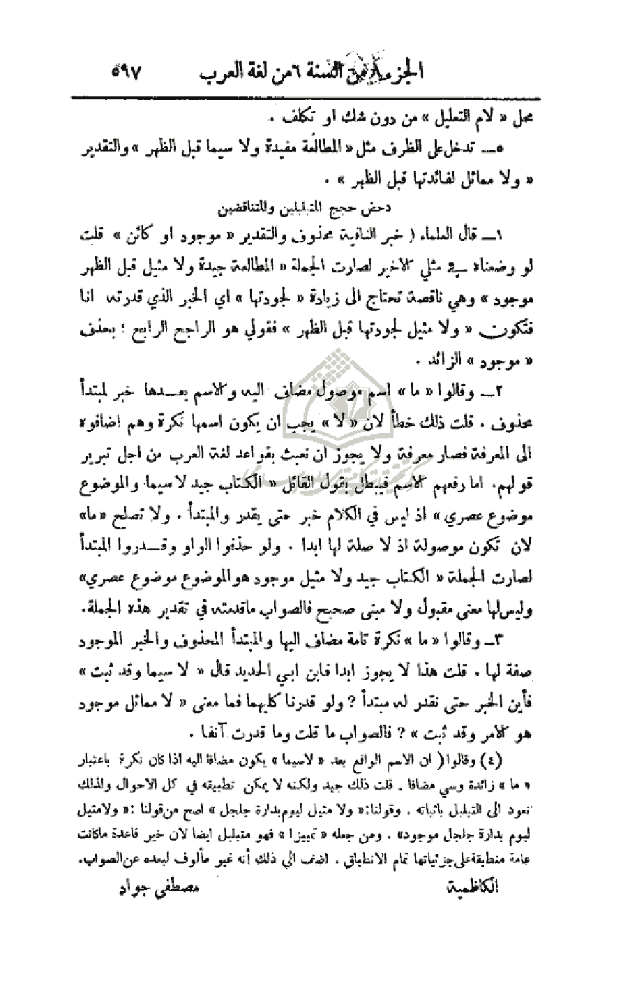 (4) - وقالوا (أن الاسم الواقع بعد (لاسيما) يكون مضافا إليه إذا كان نكرة باعتبار (ما) زائدة وسي مضافا. قلت ذلك جيد ولكنه لا يمكن تطبيقه في كل الأحوال ولذلك نعود إلى التبلبل بإثباته. وقولنا: (ولا مثيل ليوم بدارة جلجل) أصح من قولنا: (ولا مثيل ليوم بدارة جلجل موجود). ومن جعله (تمييزا) فهو متبلبل أيضاً لأن خير قاعدة ما كانت عامة منطبقة على جزيئاتها تمام الانطباق، أضف إلى ذلك إنه غير مألوف لبعده عن الصواب.