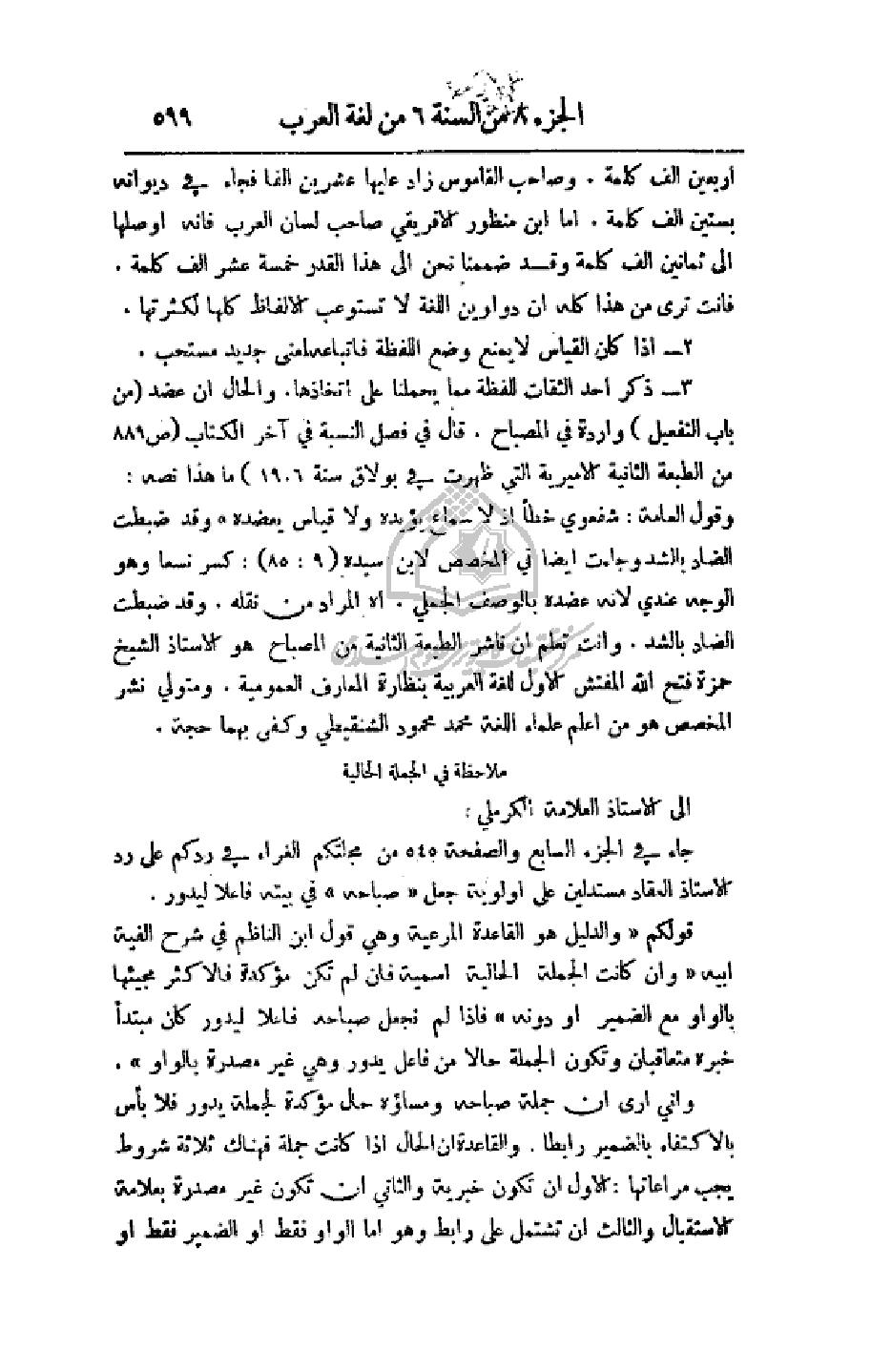 أربعين ألف كلمة. وصاحب القاموس زاد عليها عشرين ألفا فجاء في ديوانه بستين ألف كلمة. أما ابن منظور الأفريقي صاحب لسان العرب فإنه أوصلها إلى ثمانين ألف كلمة وقد ضمنا نحن إلى هذا القدر خمسة عشر ألف كلمة. فأنت ترى من هذا كله أن دواوين اللغة لا تستوعب الالفاظ كلها لكثرتها.