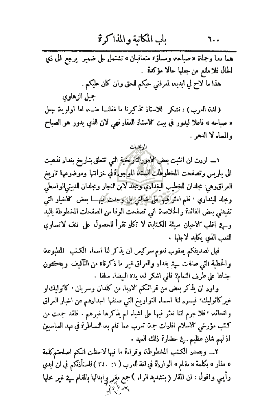 وأود أن يذكر بعض من قرائكم الأدباء من كلدان وسريان، كاثوليك أو غير كاثوليك، فيسرد لنا أسماء التواريخ التي صنفها أجدادهم عن أخبار العراق وأنحائه. فلا جرم إننا نعثر فيها على أشياء لم يذكرها غيرهم. فلقد جمعت من كتب مؤرخي الإسلام إفادات جمة تعرب عما قام به النساطرة في عهد العباسيين إذ لهم شأن عظيم في حضارة ذلك العهد.