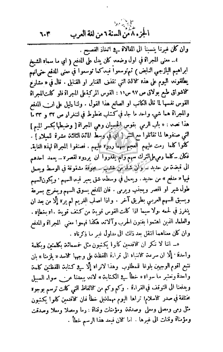 4 - معنى المجراة في أول وضعه كان يدل على المدفع (أي ما سماه الشيخ إبراهيم اليازجي النابض) ثم توسعوا فيه كما توسعوا في معنى المدفع حتى أنهم يطلقونه اليوم على هذه الآلة التي تقذف القنابر أو القنابل. قال في (مشارع الأشواق طبع بولاق ص 97 س 11: القوس المركبة المجراة فلو كانت المجراة القوس نفسها لما قال الكاتب أو الصانع هذا القول. ولنا دليل على أن المدفع والمجراة هما شيء واحد ما جاء في كتاب مخطوط في لننغراد ص 32 و33 ما هذا نصه: (باب الرمي بقوس الحسبان وهي الجراة (وضبطها بكسر الميم) التي صنفوها لما تقاتلوا مع التتر (أي في وسط المائة الثالثة عشرة للميلاد). كانوا كلما رمت عليهم العجم سهما ردوه عليهم. فصنفوا المجراة لهذه الغاية. فكان - كلما رمي على الترك سهم ولم يقدروا أن يردوه لقصره - يعمد أحدهم إلى قبضة من حديد -