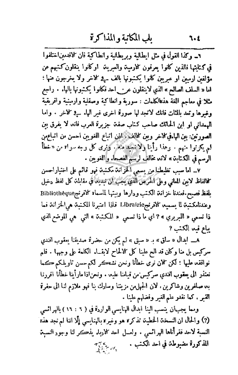 7 - أما سبب تغليطنا من يسمي الخزانة مكتبة فهو قائم على اختيار أحسن الألفاظ لأبين المعاني وعلى الحرص الذي يجب أن نبديه في مقابلة كل لفظ دخيل بلفظ فصيح، فعندنا خزانة الكتب ودارها وبيتها لما سماه الإفرنج وعندنا مكتبة لما يسميه الإفرنج فإذا اعتبرنا