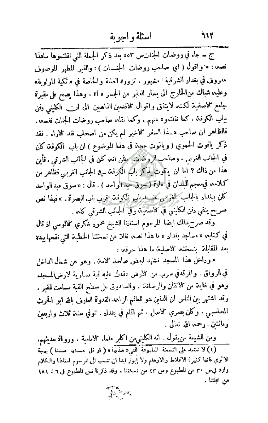 الشرقية، مشهور، تزوره العامة والخاصة في (تكية المولوية) وعليه شباك من الخارج إلى يسار العابر من الجسر) أهـ. وهذا يصح على مقبرة جامع الأصفية لكنه لا يتفق وأقوال الأقدمين الذاهبين إلى أن الكليني دفن بباب الكوفة، كما نقلتموه عنهم، وكما نقله صاحب روضات الجنات نفسه. فالظاهر أن صاحب هذا السفر الأخير لم يكن من أصحاب نقد الآراء. فقد ذكر ياقوت الحموي (وياقوت حجة في هذا الموضوع) أن باب الكوفة كان في الجانب الغربي، وصاحب الروضات يظن إنه كان في الجانب الشرقي، فأين هذا من ذاك؟ أما أن ياقوت يذكر باب الكوفة في الجانب الغربي فظاهر من كلامه في معجم البلدان في مادة (سوق عبد الواحد). قال: (سوق عبد الواحد كان ببغداد بالجانب الغربي عند باب الكوفة قرب باب البصرة). فهذا نص صريح ينفي دفن الكليني في الأصفية وفي الجانب الشرقي كله.