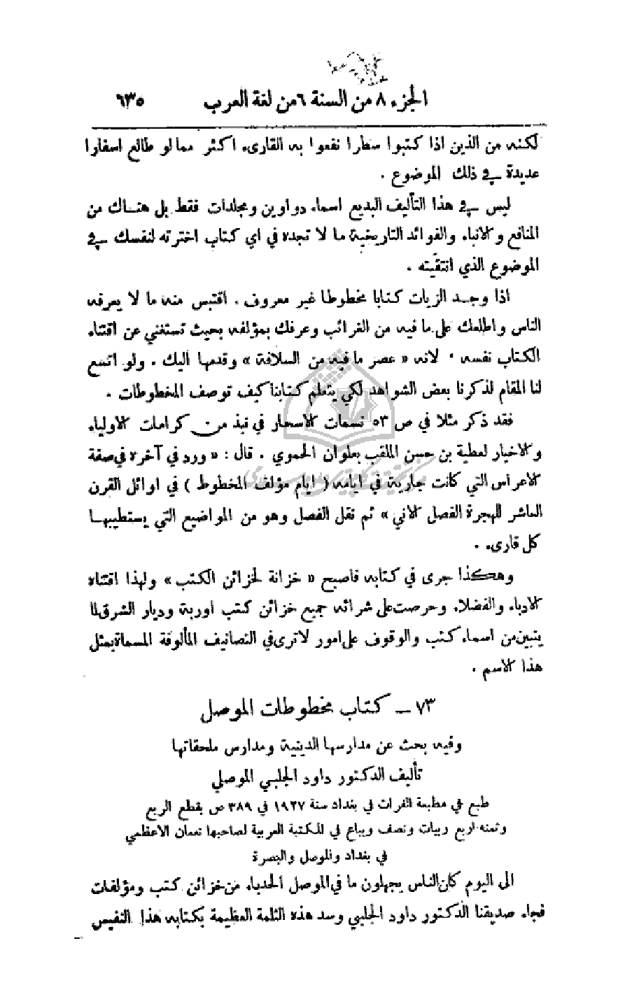 إلى اليوم كان الناس يجهلون ما في الموصل الحدباء من خزائن كتب ومؤلفات فجاء صديقنا الدكتور داود الجلبي وسد هذه الثلمة العظيمة بكتابه هذا النفيس