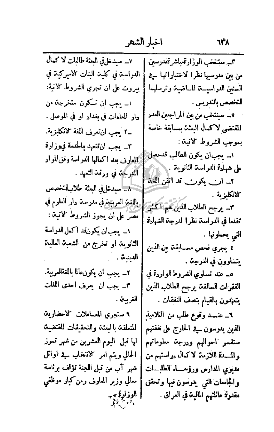 8 - سيدخل في البعثة طلاب للتخصص باللغة العربية في مدرسة دار العلوم في مصر على أن يجوز الشروط الآتية: