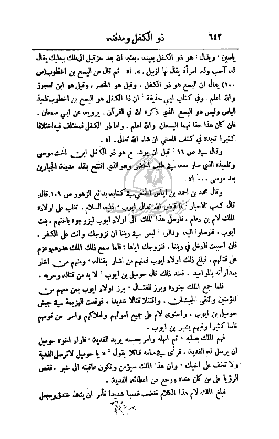 ياسين، ويقال: هو ذو الكفل بعينه، بعثه الله بعد حزقيل إلى ملك ببعلبك يقال له آحب وله امرأة يقال لها ازبيل. .). ثم قال عن اليسع بن اخطوب (ص100) يقال أن اليسع هو ذو الكفل. وقيل هو الخضر، وقيل هو ابن العجوز والله اعلم. وفي كتاب أبي حذيفة: أن ذا الكفل هو اليسع بن اخطوب تلميذ الياس وليس هو اليسع الذي ذكره الله في القرآن. يرويه عن أبي سمعان. فإن كان هذا حقا فهما اليسعان والله اعلم. وأما ذو الكفل فمختلف فيه اختلافا كثيرا تجده في كتاب المعاني إن شاء الله تعالى. أهـ.