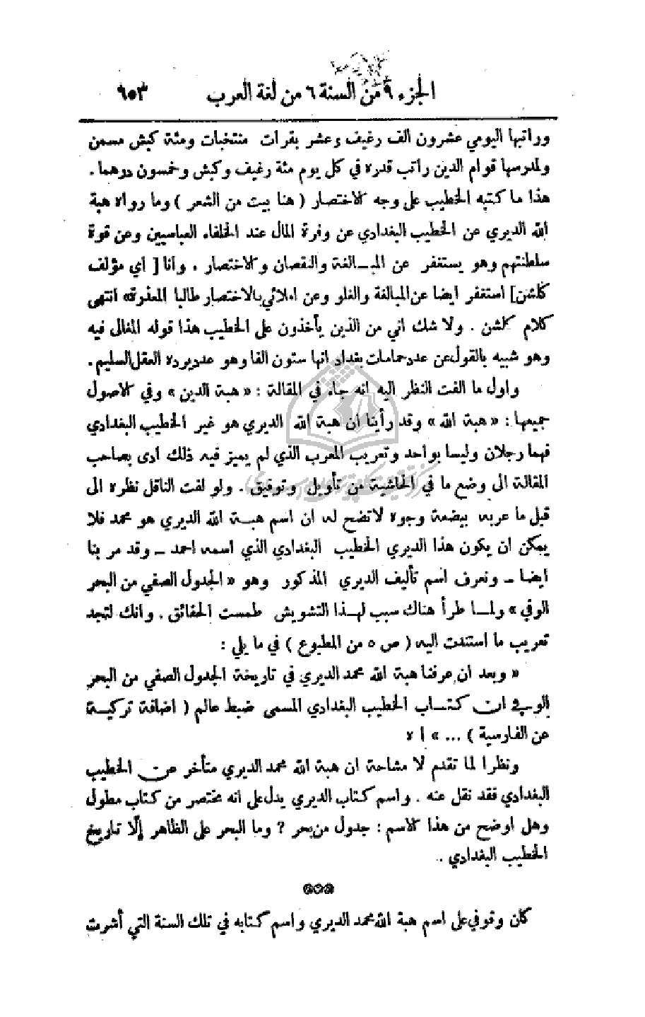 وأول ما الفت النظر إليه إنه جاء في المقالة: (هبة الدين) وفي الأصول جميعها: (هبة الله) وقد رأينا أن هبة الله الديري هو غير الخطيب البغدادي فهما رجلان وليسا بواحد وتعريب المعرب الذي لم يميز فيه ذلك أدى بصاحب المقالة إلى وضع ما في الحاشية من تأويل وتوفيق. ولو لفت الناقل نظره إلى قبل ما عربه ببضعة وجوه لاتضح له أن أسم هبة الله