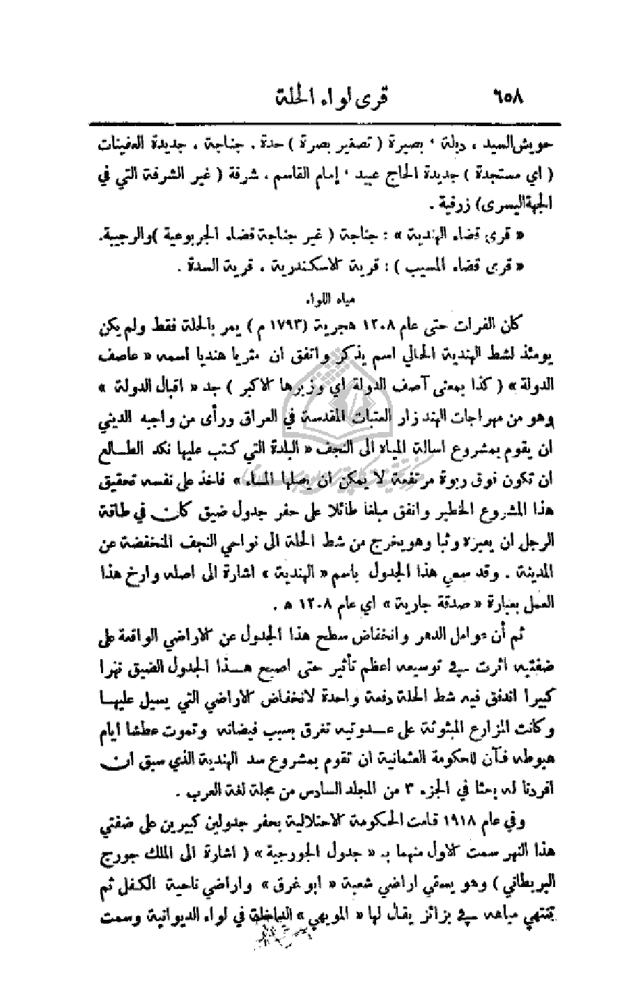 نكد الطالع أن تكون فوق ربوة مرتفعة لا يمكن أن يصلها الماء) فأخذ على نفسه تحقيق هذا المشروع الخطير وانفق مبلغا طائلا على حفر جدول ضيق كان في طاقة الرجل أن يعبره وثبا وهو يخرج من شط الحلة إلى نواحي النجف المنخفضة عن المدينة. وقد سمي هذا الجدول باسم (الهندية) إشارة إلى اصله وأرخ هذا العمل بعبارة (صدقة جارية) أي عام 1208 هـ.