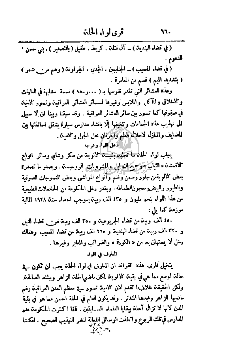 يتخيل قارئ هذه الفوائد أن المعارف في لواء الحلة يجب أن تكون في حالة أوسع مما هي في بقية الألوية لمكان ماضي الحلة الزاهر وبيئته الصالحة. ولكن الحقيقة خلاف ما تقدم لأن الأمية تسود في معظم المدن العراقية رغم ماضيها الزاهر ومجدها المندثر. وقد يكون العلم في الحلة أحسن مما هو في بقية المدن لأنها لا تزال آهلة ببقايا العلماء السابقين. فإذا أكثرت الحكومة عدد المدارس في تلك الربوع واتخذت الوسائل الفعالة لنشر التهذيب الصحيح، أمكننا
