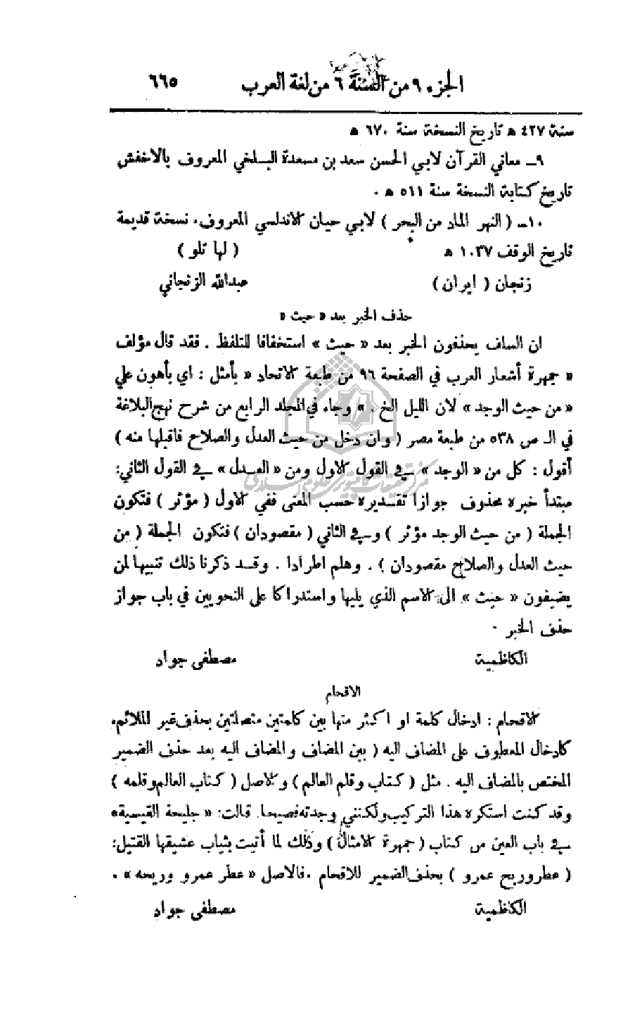 9 - معاني القرآن لأبي الحسن سعد بن مسعدة البلخي المعروف بالأخفش تاريخ كتابة النسخة سنة 511 هـ.