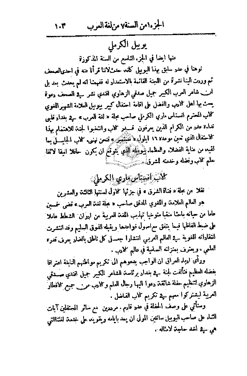 نوهنا في عدد سابق بهذا اليوبيل كأنه حدث قرأنا عنه في إحدى الصحف ثم وردت إلينا نشرة من اللجنة القائمة بالاستعداد له ففهمنا إنه لم يحدث بعد بل أن شاعر العرب الكبير جميل صدقي الزهاوي أفندي نشر في الصحف دعوة يحث بها أهل الأدب والفضل على إقامة احتفال كبير بيوبيل العلامة الشهير اللغوي الأب المحترم انستاس ماري الكرملي صاحب مجلة (لغة العرب) في بغداد فلبى نداءه عدد من الكرام الذين يعرفون قدر الأب وانتخبوا لجنة للاهتمام بهذا الاحتفال الذي تعين موعده 16 أيلول (سبتمبر) فنحن نهنئ الأب الجليل بما لقيه من عناية الفضلاء والعظماء بيوبيله الذي يتوقع أن يكون حافلا أنيقا لائقا بعلم الأب وفضله وخدمته للشرق.