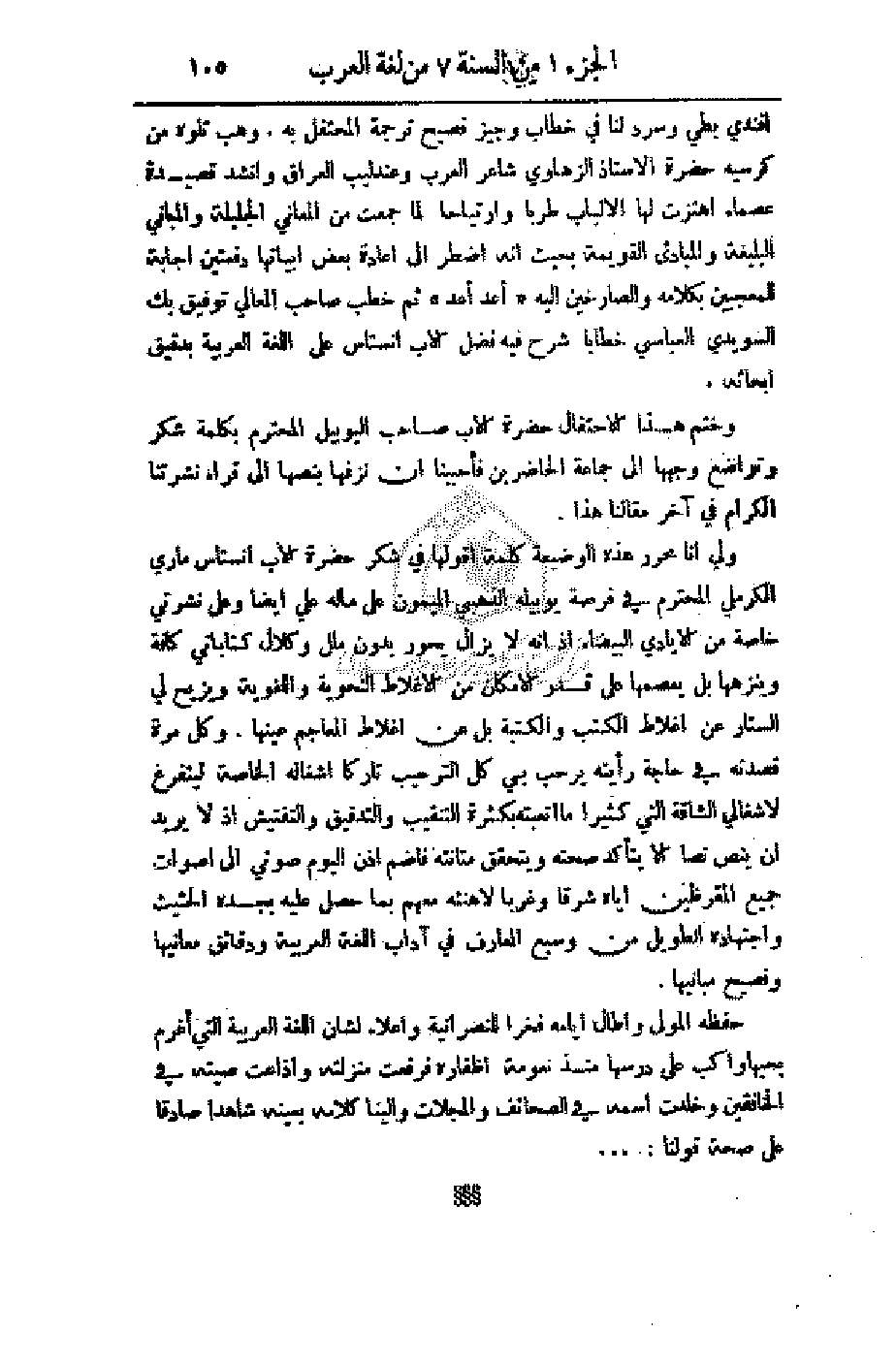 ولي أنا محرر هذه الوضيعة كلمة أقولها في شكر حضرة الأب أنستاس ماري الكرملي المحترم في فرصة يوبيله الذهبي الميمون على ما له علي أيضاً وعلى نشرتي خاصة من الأيادي البيضاء إذ أنه لا يزال يحور بدون ملل وكلال كتاباتي كافة وينزهها بل يعصمها على قدر الإمكان من الأغلاط النحوية واللغوية ويزيح لي الستار عن أغلاط الكتب والكتبة بل عن أغلاط المعاجم عينها. وكل مرة قصدته في حاجة رأيته يرحب بي كل الترحيب