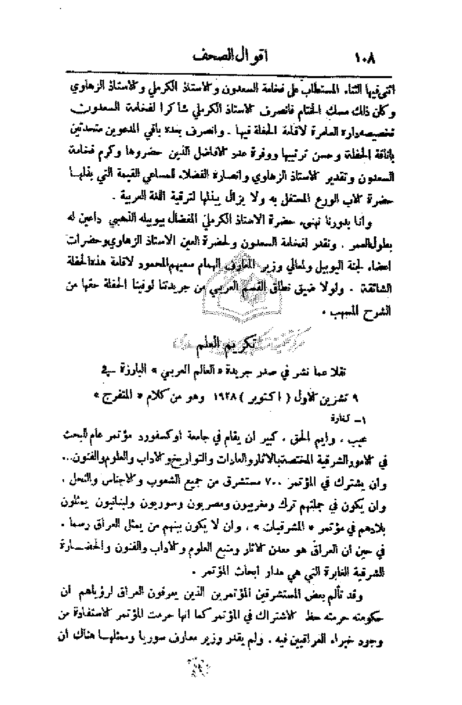 عيب، وأيم الحق، كبير أن يقام في جامعة أوكسفورد مؤتمر عام للبحث في الأمور الشرقية المختصة بالآثار والعادات والتواريخ والآداب والعلوم والفنون. . . وأن يشترك في المؤتمر 700 مستشرق من جميع الشعوب والأجناس والنحل، وأن يكون في جملتهم ترك ومغربيون ومصريون وسوريون ولبنانيون يمثلون بلادهم في مؤتمر (المشرقيات)، وأن لا