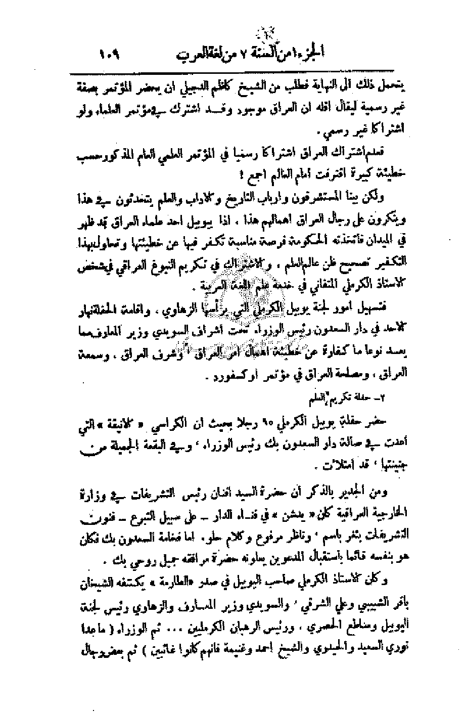 وكان الأستاذ الكرملي صاحب اليوبيل في صدر (الطارمة) يكتنفه الشيخان باقر الشبيبي وعلي الشرقي، والسويدي وزير المعارف والزهاوي رئيس لجنة اليوبيل وساطع الحصري، ورئيس الرهبان الكرمليين. . . ثم الوزراء (ما عدا نوري السعيد والحيدري والشيخ أحمد غنيمة فأنهم كانوا غائبين) ثم بعض رجال