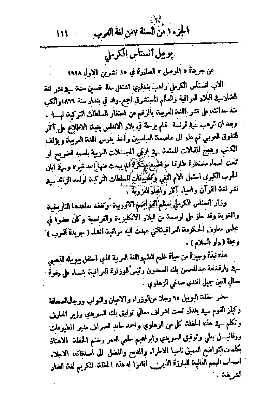 الأب انستاس الكرملي راهب بغدادي اشتغل مدة خمسين سنة في نشر لغة الضاد في البلاد العراقية والعالم المستشرق اجمع. ولد في بغداد سنة 1866 وأنكب منذ حداثته على نشر اللغة العربية بالرغم عن احتقار السلطات التركية لها. وبعد أن ترهب في فرنسة قام برحلة في بلاد الأندلس بغية الإطلاع على آثار التفوق العربي ثم عاد إلى عاصمة العباسيين وأخذ يدرس اللغة العربية ويؤلف الكتب ويدبج المقالات الممتعة في أرقى المجلات العربية باسمه الصريح أو تحت أسماء مستعارة طارقا مواضيع مبتكرة لم يبحث عنها أحد غيره وفي إبان الحرب الكبرى أحتمل الأم النفي وتضييقات السلطات التركية لولعه الزائد في نشر لغة القرآن وإحياء آثار وأمجاد العروبة.