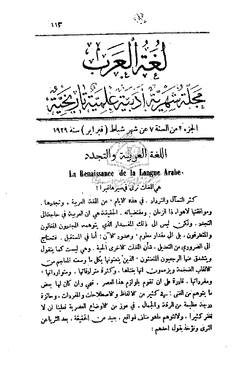 كثر التسآل والترداد. في هذه الأيام، عن اللغة العربية، وتجددها، وموافقتها لأهواء ذا الزمان، ومقتضياته. الحقيقة هي أن العربية في حاجة إلى التجدد. ولكن ليس إلى ذلك المقدار الذي يتوهمه المجددون المغالون والمتطرفون، بل إلى مقدار معلوم، ومحدود الآن؛ أما في المستقبل. فتحتاج إلى الضروري من التعديل، شأن اللغات الأخرى الحية. وهي ليست كما يتقول ويتشدق عنها الرجعيون المتعنتون، الذين ينعتونها بكل ما وسعته المعاجم من الألقاب الضخمة ويزعمون أنها بغناها، وكثرة مترادفاتها، ومتوارداتها، ومفرداتها، قادرة على أن تقوم بلوازم هذا العصر، فهي وإن كان لها بعض ما يتوهم من الغنى. في كثير من الألفاظ والاصطلاحات والمفردات، وحائزة درجة عظيمة من الرقة والجمال، في عوز من الأوضاع العصرية فعلينا أن لا نغفر كثيراً، ولا نتوهم ما هو مناف للواقع، بعيد عن الحقيقة، بعد الثريا عن الثرى ونؤخذ بقول أحدهم: