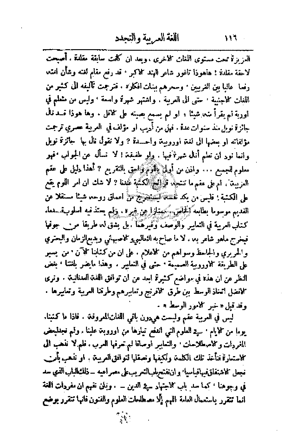 العزيزة تحت مستوى اللغات الأخرى، وبعد إن كانت سابقة مقلدة، أصبحت لاحقة مقلدة! هاهو ذا تاغور شاعر الهند الأكبر، قد رفع مقام لغته وشأن أمته رفعا عاليا بين الغربيين، وسحرهم ببنات أفكاره. فترجمت تآليفه إلى كثير من اللغات الأجنبية، حتى إلى العربية، وأشتهر شهرة واسعة، وليس من متعلم في أوربة لم يقرأ منه شيئا، لو لم يسمع بصيته على الأقل. وهاهو ذا قد نال جائزة نوبل منذ سنوات عدة. فهل من أديب أو مؤلف في العربية عصري ترجمت مؤلفاه أو بعضها إلى لغة أوروبية واحدة؟ ولا نقول نال بها جائزة نوبل وإنما نود أن نعلم أنال شهرة فيها، ولو طفيفة! لا نسأل عن الجواب، فهو معلوم للجميع. . . وإذن من أولى باللوم وأحق بالتقريع؟ أهذا دليل على عقم العربية، أم على عقم ما تنتجه قرائح الكتبة عندنا؟ لا شك أن أمر اللوم يقع على الكتبة، فليس من يكد نفسه ليستخرج من أعماق روحه شيئا مستقلا عن القديم موسوما بطابعه الخاص، ممتازا عن غيره، ولم يحتذ فيه أسلوب قدماء كتاب العربية في التعابير والوصف وغيرهما، بل يشق له طريقا من جوفها فيخرج ما هو شاعر به، لا ما صاح به الثعالبي والأصبهاني وبديع الزمان والبحتري والحريري والجاحظ وسواهم من الأعلام. على أن من كتابنا الآن، من يسير على الطريقة الأوروبية الصميمة، حتى في التعابير، وهذا ما يضر بلغتنا، بغض النظر عن أن هذه في مواضع كثيرة أبعد عن أن توافق اللغة العدنانية. ونرى الأفضل اتخاذ الوسط بين طرق الإفرنج وتعابيرهم وطرقنا العربية وتعابيرها. وقد قيل (خير الأمور الوسط).