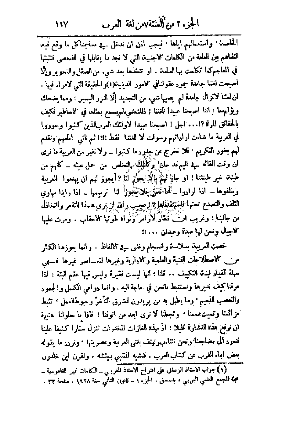 الخاصة، واستعمالهم إياها، فيجب إذن أن ندخل في معاجمنا كل ما وقع فيه التفاهم بين العامة من الكلمات الأجنبية التي لا نجد ما يقابلها في الفصحى فنثبتها في المعاجم كما تكلمت بها العامة، أو نتخذها بعد شيء من الصقل والتحوير وإلا أصبحت لغتنا جامدة جمود عقولنا في الأمور الدينية والحقيقة التي لا مراء فيها، أن لغتنا لا تزال جامدة لم يصبها شيء من التجديد إلا النزر اليسير؛ ومما يضحك ويؤلم معا؛ إننا أصبحنا عبيداً للغتنا! ذلك شيء لم يسمع بمثله في الأساطير فكيف بالحقائق المرة؟!. . . أجل! أصبحنا عبيدا لأولئك العرب الذين كتبوا وحوروا في العربية ما شاءت إراداتهم وسولت لا للغتنا فقط!!!! ثم نأتي أمامهم ونقدم لهم بخور التكريم، فلا نخرج عن حدودنا ما كتبوا - ولا نغير من العربية ما نرى أن وقت إلقائه في اليم قد حان وكذلك التخلص من حمل عبئه - كأنهم من طينة غير طينتنا! أو جاز لهم ما لا يجوز لنا؟ أيجوز لهم أن يهدموا العربية ويتلفوها - إذا أرادوا - أما نحن فلا يجوز لنا ترميمها - إذا رأينا مهاوي التلف والتصدع تحتها فاستنقذناها؟! عجيب والله أن نرى هذا التقعر والتخاذل من جانبنا؛ وغريب أن ننقاد لأوامر ونواه طوتها الأحقاب. ومرت عليها الأجيال ونحن لها عبدة وعبدان. . .!!
