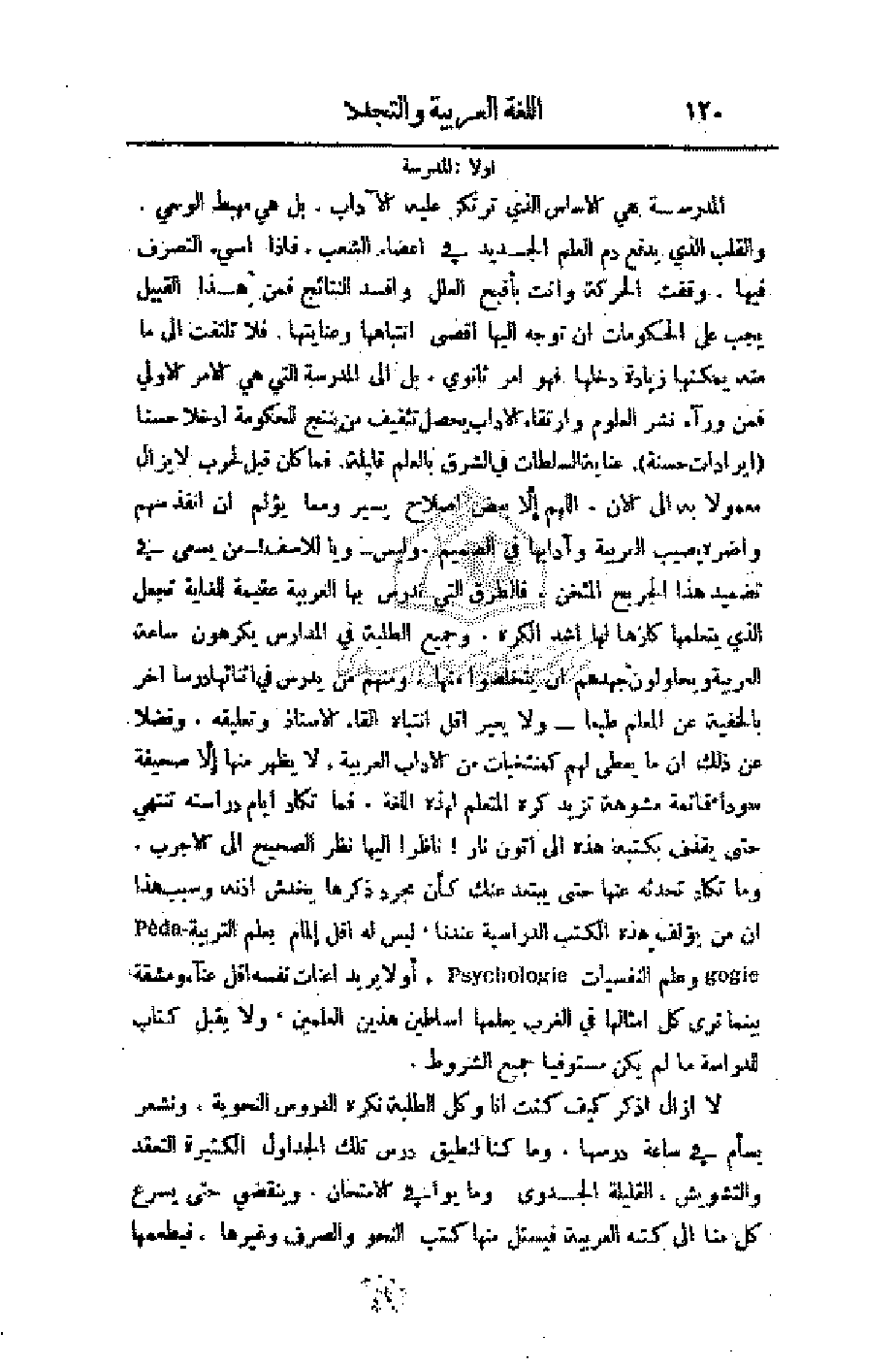 المدرسة هي الأساس الذي ترتكز عليه الآداب. بل هي مهبط الوحي. والقلب الذي يدفع دم العلم الجديد في أعضاء الشعب. فإذا أسيء التصرف فيها. وقفت الحركة وأتت بأقبح العلل وأفسد النتائج فمن هذا القبيل يجب على الحكومات أن توجه إليها أقصى انتباهها وعنايتها. فلا تلتفت إلى ما منه يمكنها زيادة دخلها. فهو أمر ثانوي. بل إلى المدرسة التي هي الأمر الأولي فمن وراء نشر العلوم وارتقاء الآداب يحصل تثقيف من ينتج للحكومة أدخلا حسنا (إيرادات حسنة). عناية السلطات في الشرق بالعلم قليلة. فما كان قبل لحرب لا يزال معمولا به إلى الآن. اللهم إلا بعض إصلاح يسير ومما يؤلم أن أنفذ سهم وأضره يصيب العربية وآدابها في الصميم. وليس - ويا للأسف! - من يسعى في تضميد هذا الجريح المثخن. فالطرق التي تدرس بها العربية عقيمة للغاية تجعل الذي يتعلمها كارها لها أشد الكره. وجميع الطلبة في المدارس يكرهون ساعة العربية ويحاولون جهدهم أن يتخلصوا منها. ومنهم من يدرس في أثنائها درسا آخر بالخفية عن المعلم طبعا - ولا يعير أقل انتباه إلقاء الأستاذ وتعليقه. وفضلا عن ذلك أن ما يعطى لهم كمنتخبات من الآداب العربية، لا يظهر منها إلا صحيفة سوداء قاتمة مشوهة تزيد كره المتعلم لهذه اللغة. فما تكاد أيام