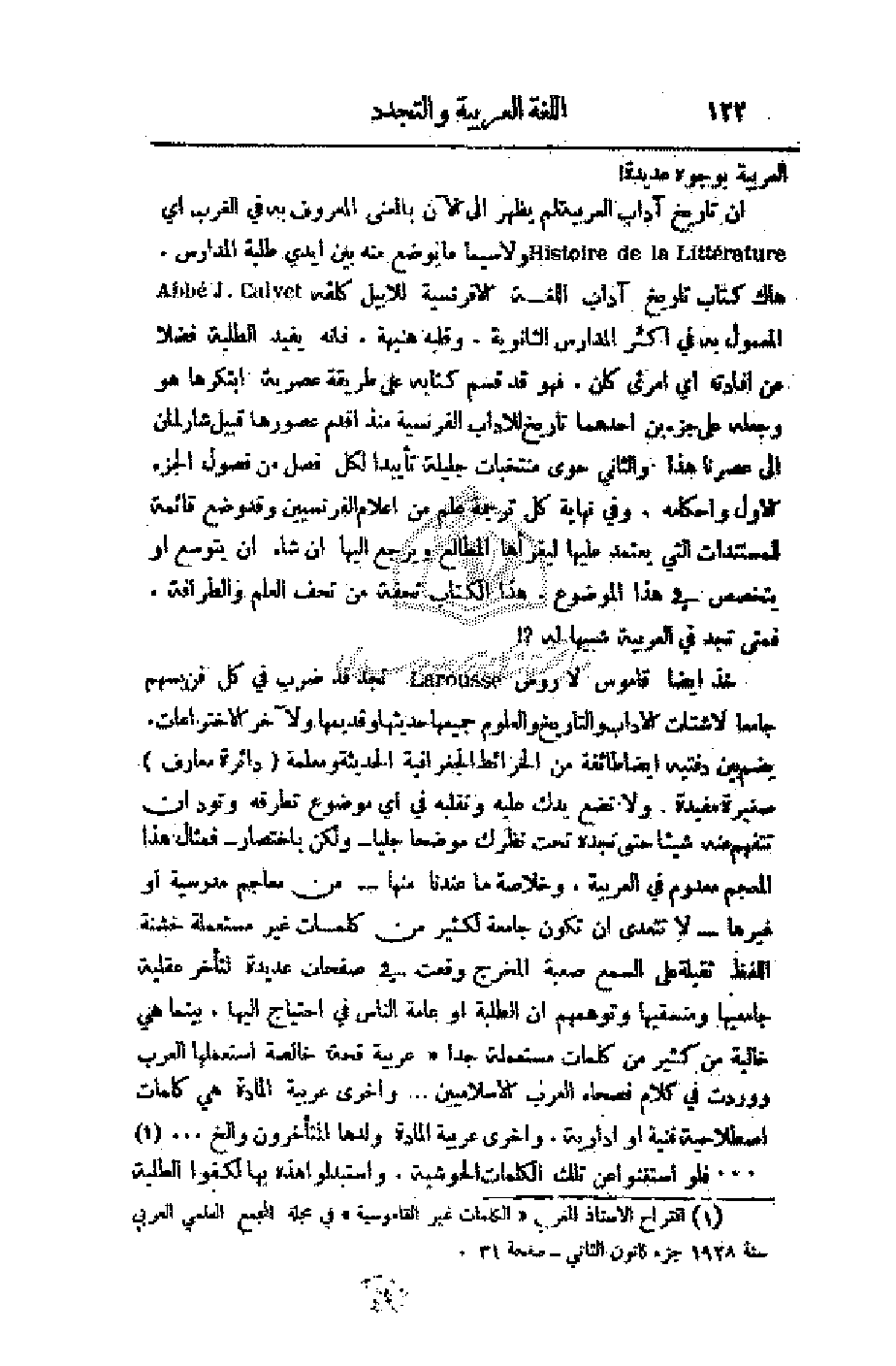 خذ أيضاً قاموس لاروس تجد قد ضرب في كل فن بسهم جامعا لأشتات الآداب والتاريخ والعلوم جميعها حديثها وقديمها ولآخر الاختراعات، يضم بين دفتيه أيضا طائفة من الخرائط الجغرافية الحديثة ومعلمة (دائرة معارف) صغيرة مفيدة. ولا تضع يدك عليه وتقلبه في أي موضوع تطرقه وتود أن تتفهم عنه شيئا حتى تجده تحت نظرك موضحا جليا - ولكن باختصار - فمثال هذا المعجم معدوم في العربية. وخلاصة ما عندنا منها - من معاجم مدرسية أو غيرها - لا تتعدى أن تكون جامعة لكثير من كلمات غير مستعملة خشنة اللفظ ثقيلة على السمع صعبة المخرج وقعت في صفحات عديدة لتأخر عقلية جامعيها ومنسقيها وتوهمهم أن الطلبة أو عامة الناس في احتياج إليها. بينما هي خالية من كثير من كلمات مستعملة جدا (عربية قحة خالصة استعملها العرب ووردت في كلام فصحاء العرب الإسلاميين. . . وأخرى عربية المادة هي كلمات اصطلاحية فنية أو