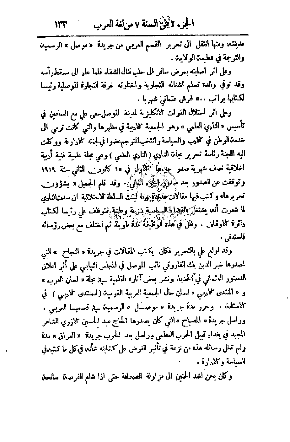 مدينته ومنها انتقل إلى تحرير القسم العربي من جريدة (موصل) الرسمية والترجمة في مطبعة الولاية.