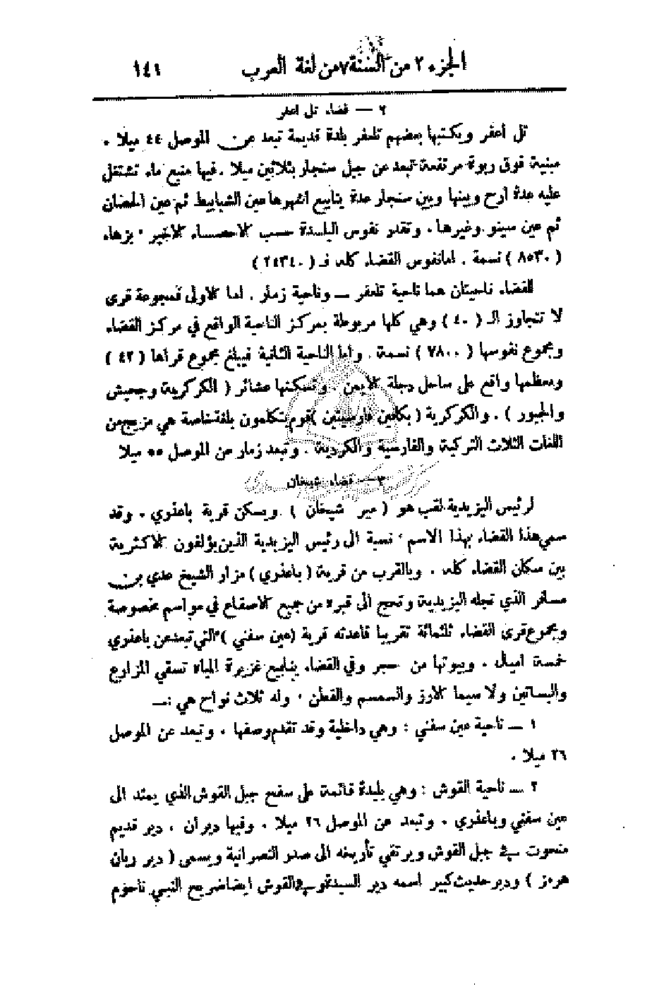 تل أعفر ويكتبها بعضهم تلعفر بلدة قديمة تبعد عن الموصل 44 ميلا. مبنية فوق ربوة مرتفعة تبعد عن جبل سنجار بثلاثين ميلا. فيها منبع ماء تشتغل عليه عدة أرح وبينها وبين سنجار عدة ينابيع أشهرها عين الشبابيط ثم عين الحصان ثم عين سينو وغيرها. وتقدر نفوس البلدة حسب الإحصاء الأخير، بزهاء (8530) نسمة. أما نفوس القضاء كله