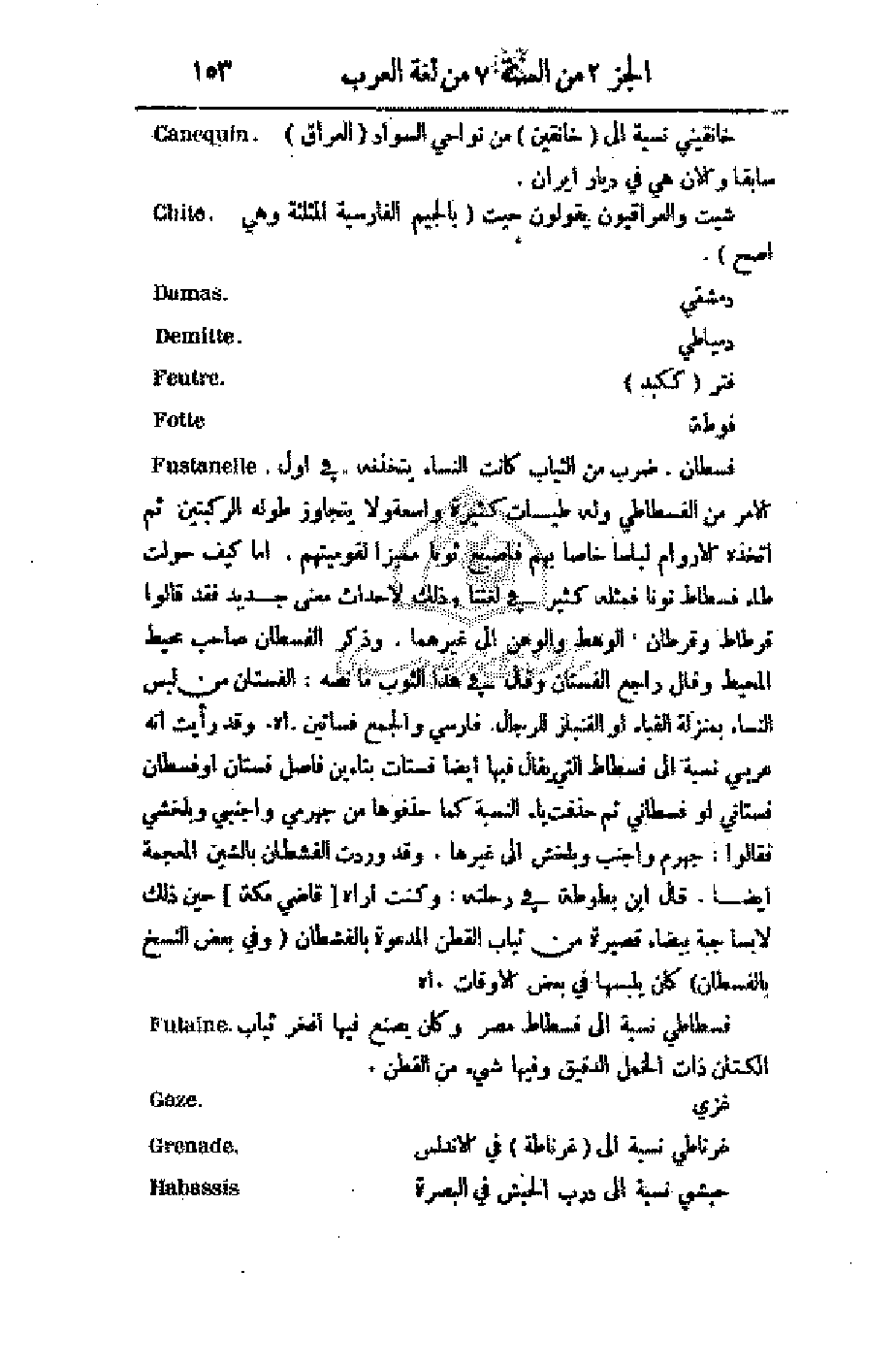 نسبة إلى (خانقين) من نواحي السواد (العراق) سابقا والآن هي في ديار والعراقيون يقولون جيت (بالجيم الفارسية المثلثة وهي أصح). فتر (ككبد) ضرب من الثياب كانت النساء يتخذونه في أول الأمر من الفسطاطي وله طيات كثيرة واسعة ولا يتجاوز طوله الركبتين ثم أتخذه الأورام لباسا خاصا بهم فأصبح ثوبا مميزا لقوميتهم. أما كيف حولت طاء فسطاط نونا فمثله كثير في لغتنا وذلك لإحداث معنى جديد فقد قالوا قرطاط وقرطان، الوهط والوهن إلى غيرهما. وذكر الفسطان صاحب محيط المحيط وقال راجع الفستان وقال في هذا الثوب ما نصه: الفستان من لبس النساء بمنزلة القباء أو القنباز للرجال. فارسي والجمع فساتين. اهـ. وقد رأيت أنه عربية نسبة إلى فسطاط التي يقال فيها أيضاً فستات بتاءين فاصل فستان أو فسطان فستاني أو فسطاني ثم حذفت ياء النسبة كما حذفوها من جهرمي وأجنبي وبلخشي فقالوا: