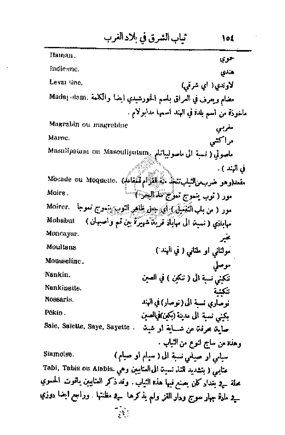 لاوندي (أي شرقي) مضام ويعرف في العراق باسم الخورشيدي أيضاً والكلمة مأخوذة من اسم بلدة في الهند اسمها مدابولام. (نسبة إلى ماصوليباتام في الهند). (وهو ضرب من الثياب تتخذ منه القرام للمقاعد) مور (ثوب يتموج تموج ماء البحر) مور (من باب التفعيل) أي جعل ظاهر الثوب يتموج مهاباذي (نسبة إلى مهاباذ قرية شهيرة بين قم وأصبهان) مولتاني أو ملتاني (في الهند) ننكيني نسبة إلى (ننكين) في بكيني نسبة إلى مدينة (بكين) في صاية محرفة عن شاية أو شيه وهذه عن ساج لنوع من الثياب. سيامي أو صيامي نسبة إلى (سيام أو صيام) عتابي (بتشديد التاء نسبة إلى العتابيين وهي