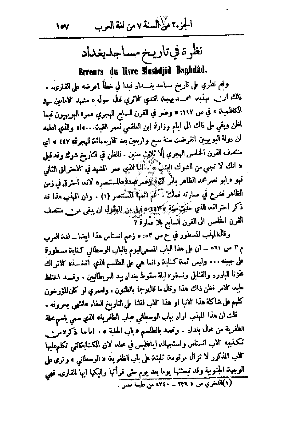 وقع نظري على تاريخ مساجد بغداد فبدا لي خطأ أعرضه على القارئ. ذلك أن مهذبه محمد بهجة أفندي الأثري قال حول (مشهد الإمامين في الكاظمية) في ص 117: (وعمر في القرن السابع الهجري عمره البويهيون فيما أظن وبقي على ذلك إلى أيام وزارة ابن العلقمي فعمر القبة. . .) اهـ والذي أعلمه أن دولة البويهيين انقرضت سنة سبع وأربعين بعد الأربعمائة للهجرة (447) أي منتصف القرن الخامس الهجري إلا ثلاث سنين. فالظن في التاريخ شوك وقد قيل (إنك لا تجني من الشوك العنب). أما الذي عمر المشهد في الاحتراق الثاني فهو (أبو نصر محمد الظاهر بأمر الله) وعمره بعده (المستنصر) لأنه أحترق في زمن الظاهر فشرع في عمارته فمات. ثم أتمها المستنصر. وإن المهذب هذا قد ذكر احتراقه الذي حدث سنة (443) فهل من المعقول أن يبقى من منتصف القرن الخامس إلى القرن السابع بلا عمارة؟