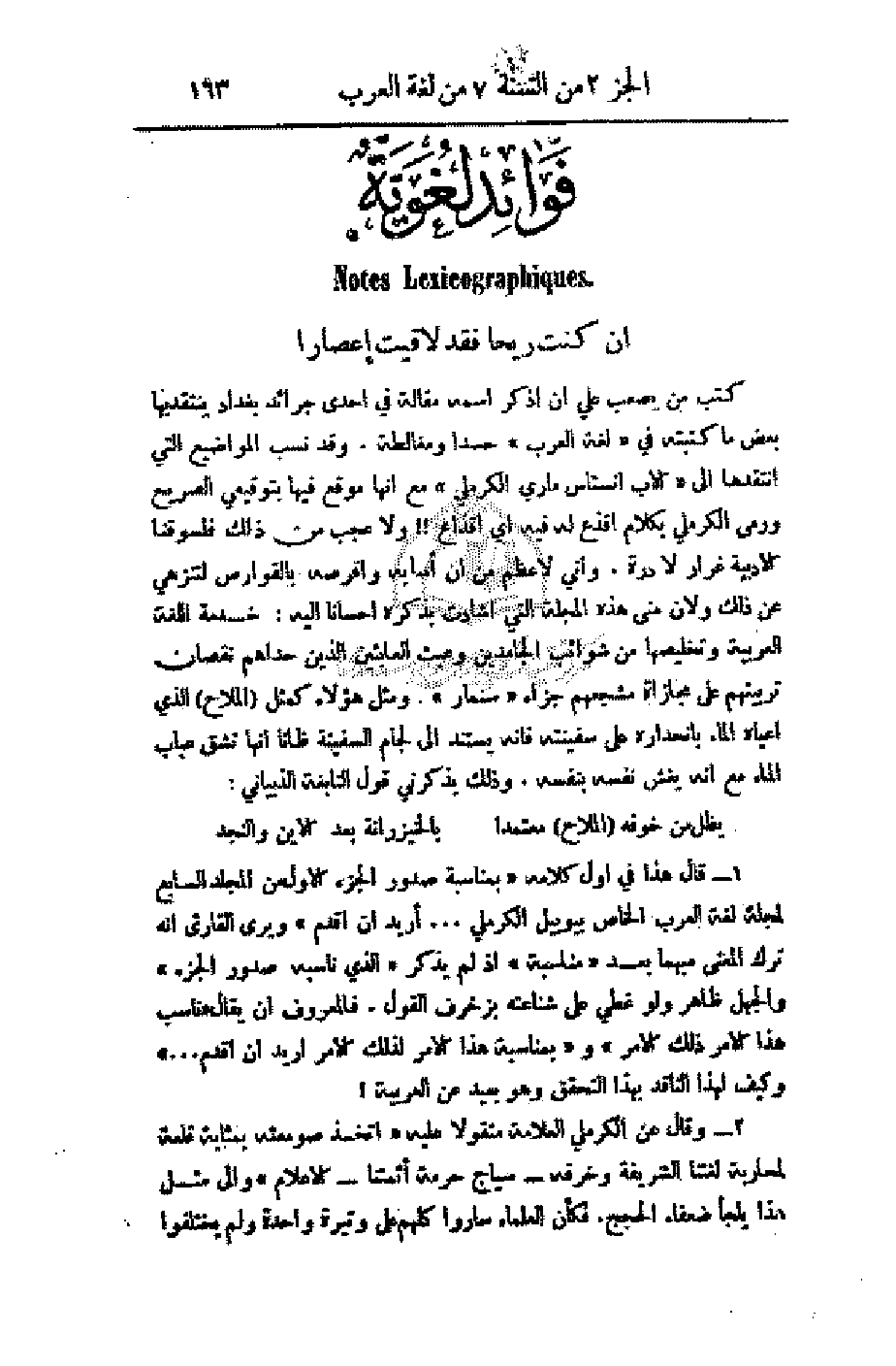 1 - قال هذا في أول كلامه (بمناسبة صدور الجزء الأول من المجلد السابع لمجلة لغة العرب الخاص بيوبيل الكرملي. . . أريد أن أقدم) ويرى القارئ أنه ترك المعنى مبهما بعد (مناسبة) إذ لم يذكر (الذي ناسبه صدور الجزء) والجهل ظاهر ولو غطي على شناعته بزخرف القول. فالمعروف أن يقال (ناسب هذا الأمر ذلك الأمر) و (بمناسبة هذا الأمر لذلك الأمر أريد أن أقدم. . .) وكيف لهذا الناقد بهذا التحقيق وهو بعيد عن العربية!