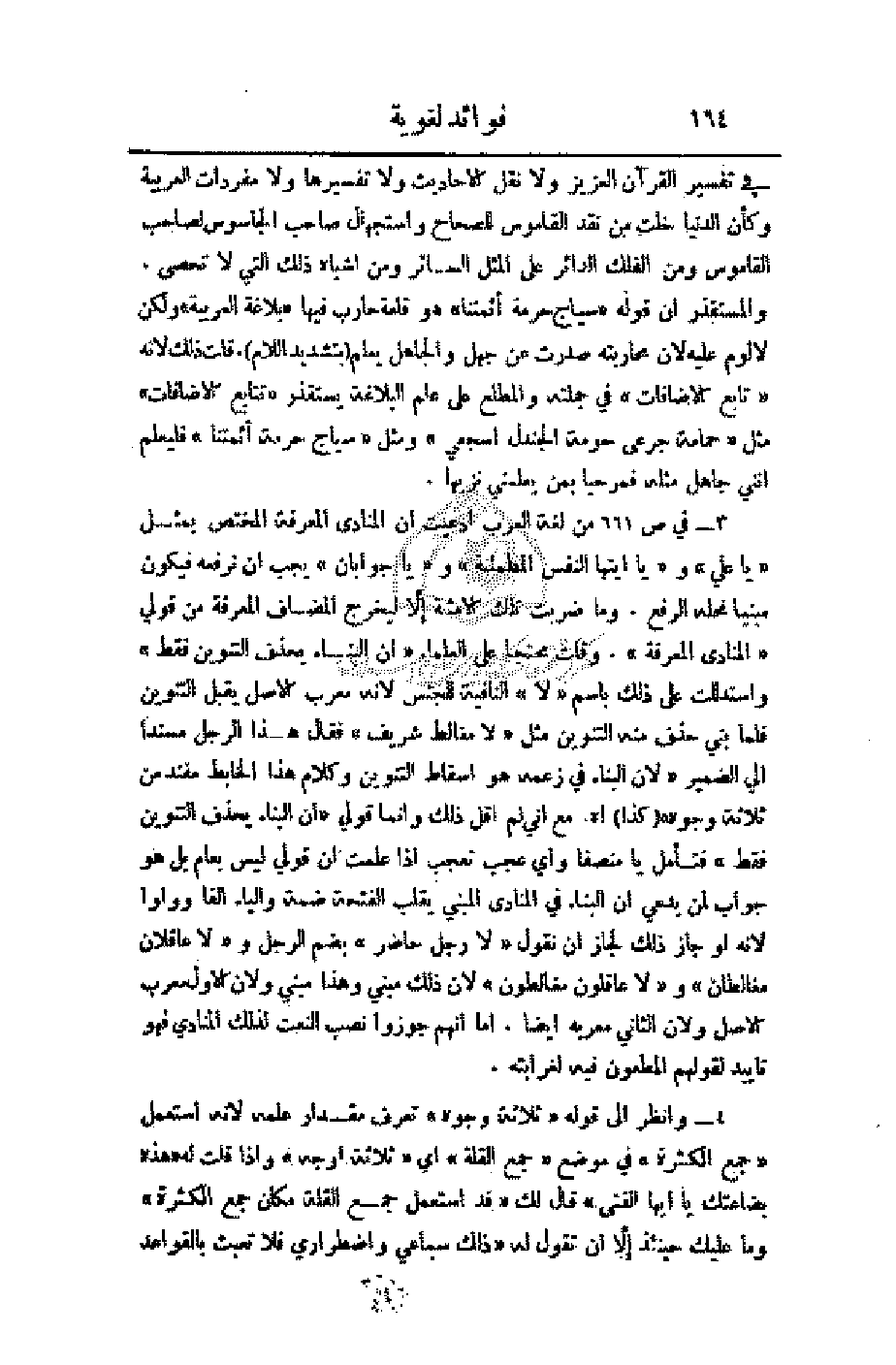 3 - في ص 661 من لغة العرب ادعيت أن المنادى المعرفة المختص بمثل (يا علي) و (يا أيتها النفس المطمئنة) و (يا جوابان) يجب أن نرفعه فيكون مبنيا محله الرفع. وما ضربت تلك الأمثلة إلا ليخرج المضاف المعرفة من قولي (المنادى المعرفة). وقلت محتجا على العلماء (إن البناء يحذف التنوين فقط) واستدللت على ذلك باسم (لا) النافية للجنس لأنه معرب الأصل يقبل التنوين فلما بني حذف منه التنوين مثل (لا مغالط شريف) فقال هذا الرجل مسندا إلي الضمير (لأن البناء في زعمه هو إسقاط التنوين وكلام هذا الخابط مفند من ثلاثة وجوه) (كذا) اهـ. مع إني لم أقل ذلك وإنما قولي (إن البناء يحذف التنوين فقط) فتأمل يا منصفا وأي عجب تعجب إذا علمت أن قولي ليس بعام بل هو جواب لمن يدعي أن البناء في المنادى المبني يقلب الفتحة ضمة والياء ألفا وواوا لأنه لو جاز ذلك لجاز أن نقول (لا رجل حاضر) بضم الرجل و (لا عاقلان مغالطان) و (لا عاقلون مغالطون) لأن ذلك مبني وهذا مبني ولأن الأول معرب الأصل ولأن الثاني معربه أيضا. أما أنهم جوزوا نصب النعت لذلك المنادي فهو تأييد لقولهم المطعون فيه لغرابته.