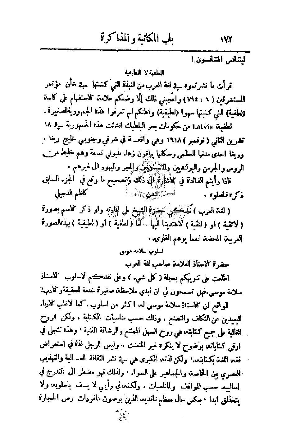 أطلعت على تنويهكم بمجلة (كل شيء) وعلى نقدكم لأسلوب الأستاذ سلامة موسى. فهل تسمحون لي أن أبدي ملاحظة صغيرة خدمة للحقيقة والأدب؟