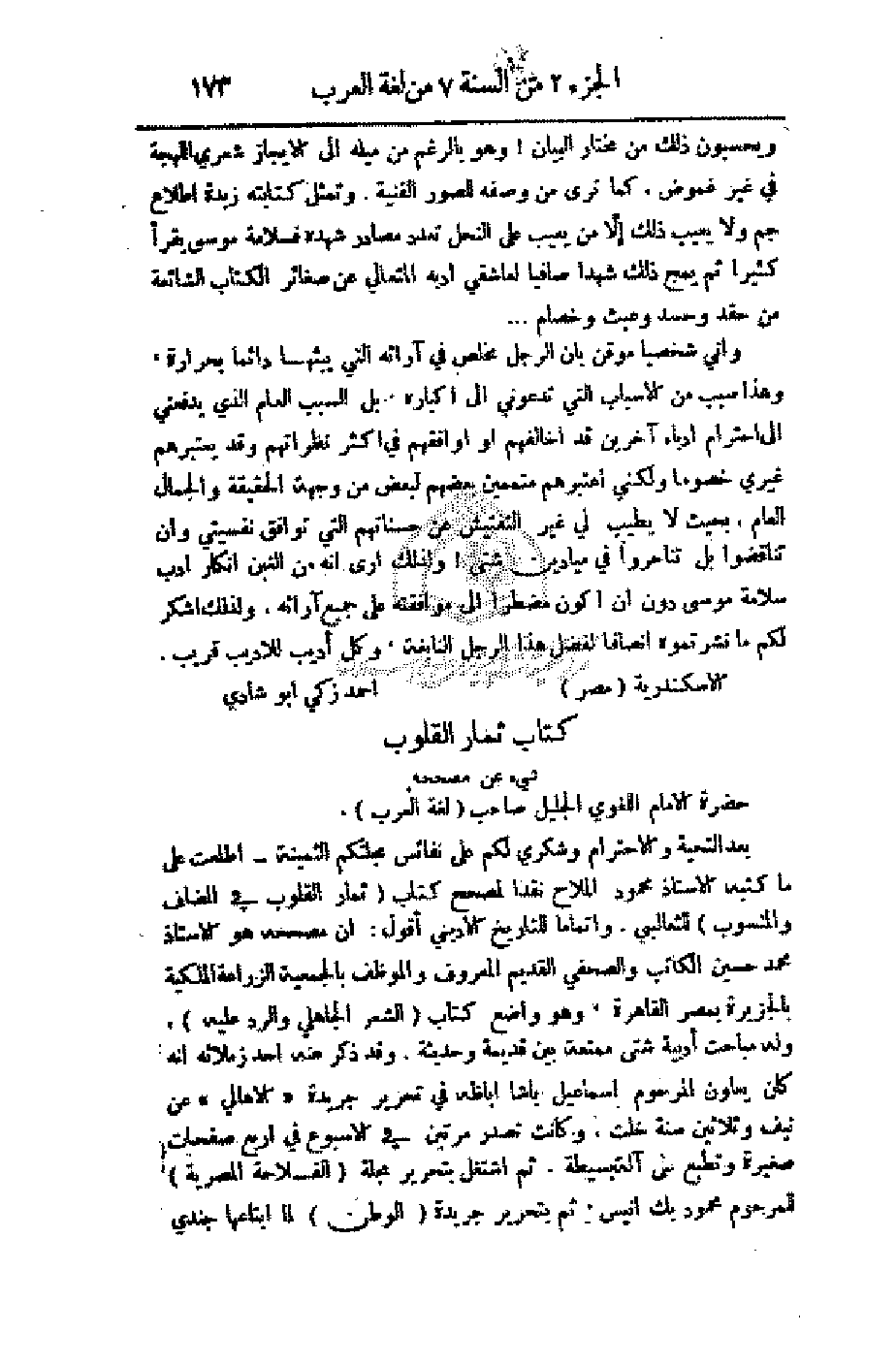 بعد التحية والاحترام وشكري لكم على نفائس مجلتكم الثمينة - أطلعت على ما كتبه الأستاذ محمود الملاح نقدا لمصحح كتاب (ثمار القلوب في المضاف والمنسوب) للثعالبي. وإتماما للتاريخ الأدبي أقول: إن مصححه هو الأستاذ محمد حسين الكاتب والصحفي القديم المعروف والموظف بالجمعية الزراعية الملكية بالجزيرة بمصر القاهرة، وهو واضع كتاب (الشعر الجاهلي والرد عليه)، وله مباحث أدبية شتى ممتعة بين قديمه وحديثه. وقد ذكر عنه أحد زملائه إنه كان يعاون المرحوم إسماعيل باشا اباظة في تحرير جريدة (الأهالي) عن نيف وثلاثين سنة خلت، وكانت تصدر مرتين في الأسبوع في أربع صفحات صغيرة وتطبع على آلة بسيطة. ثم أشتغل بتحرير مجلة (الفلاحة المصرية) للمرحوم محمود بك أنيس. ثم بتحرير جريدة (الوطن) لما ابتاعها جندي