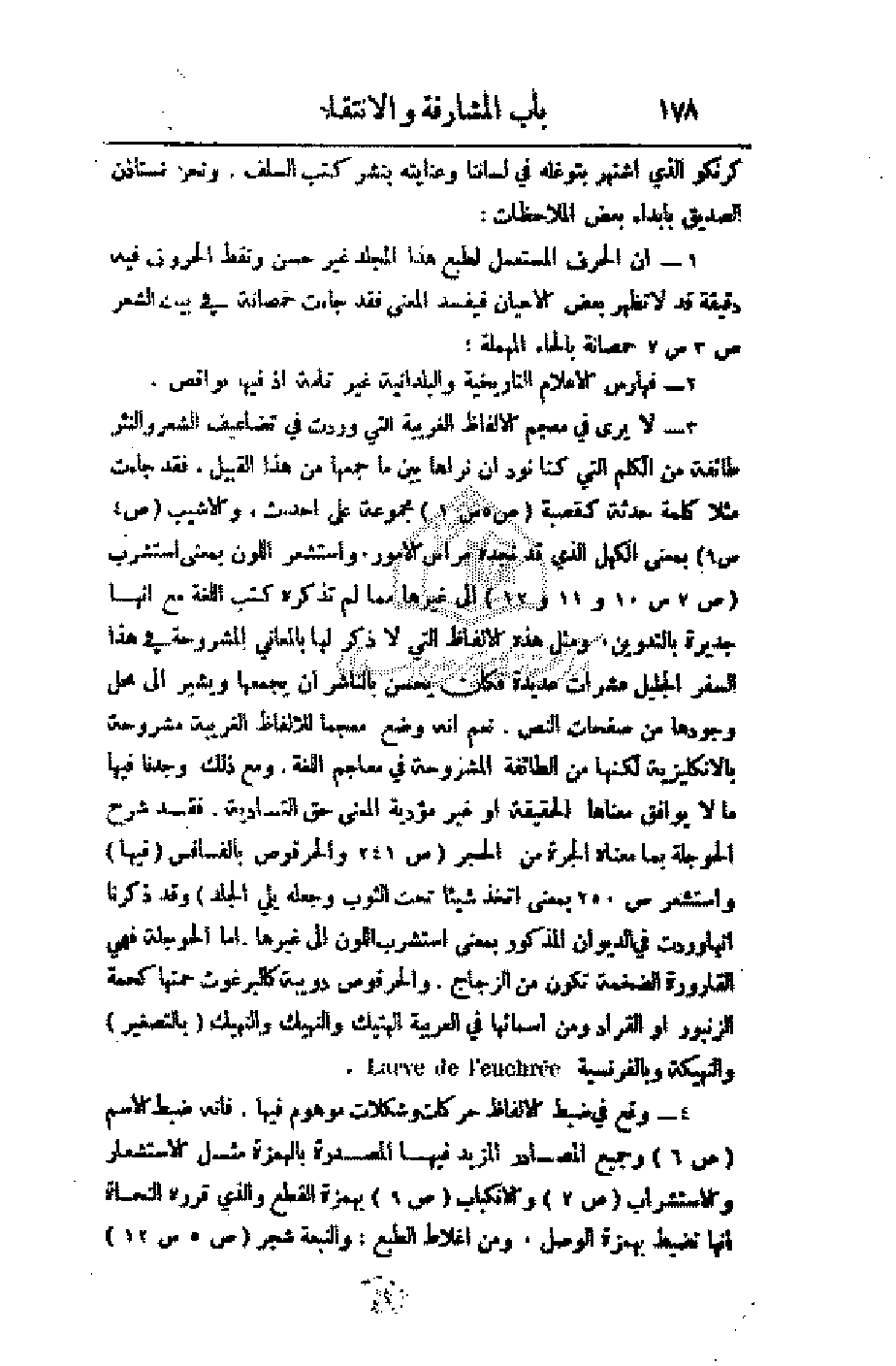 3 - لا يرى في معجم الألفاظ الغريبة التي وردت في تضاعيف الشعر والنثر طائفة من الكلم التي كنا نود أن نراها بين ما جمعها من هذا القبيل. فقد جاءت مثلا كلمة حدثة كقصبة (ص 5 س 1) مجموعة على أحداث، والأشيب (ص 4 س9) بمعنى الكهل الذي قد نجده مراس الأمور، واستشعر اللون بمعنى أستشرب (ص 7 س 10 و11 و12) إلى غيرها مما لم تذكره كتب اللغة مع أنها جديرة بالتدوين، ومثل هذه الألفاظ التي لا ذكر لها بالمعاني المشروحة في هذا السفر الجليل عشرات عديدة فكان يحسن بالناشر أن يجمعها ويشير إلى محل وجودها من صفحات النص. نعم إنه وضع معجماً للألفاظ الغريبة مشروحة بالإنكليزية لكنها من الطائفة المشروحة في معاجم اللغة. ومع ذلك وجدنا فيها ما لا يوافق