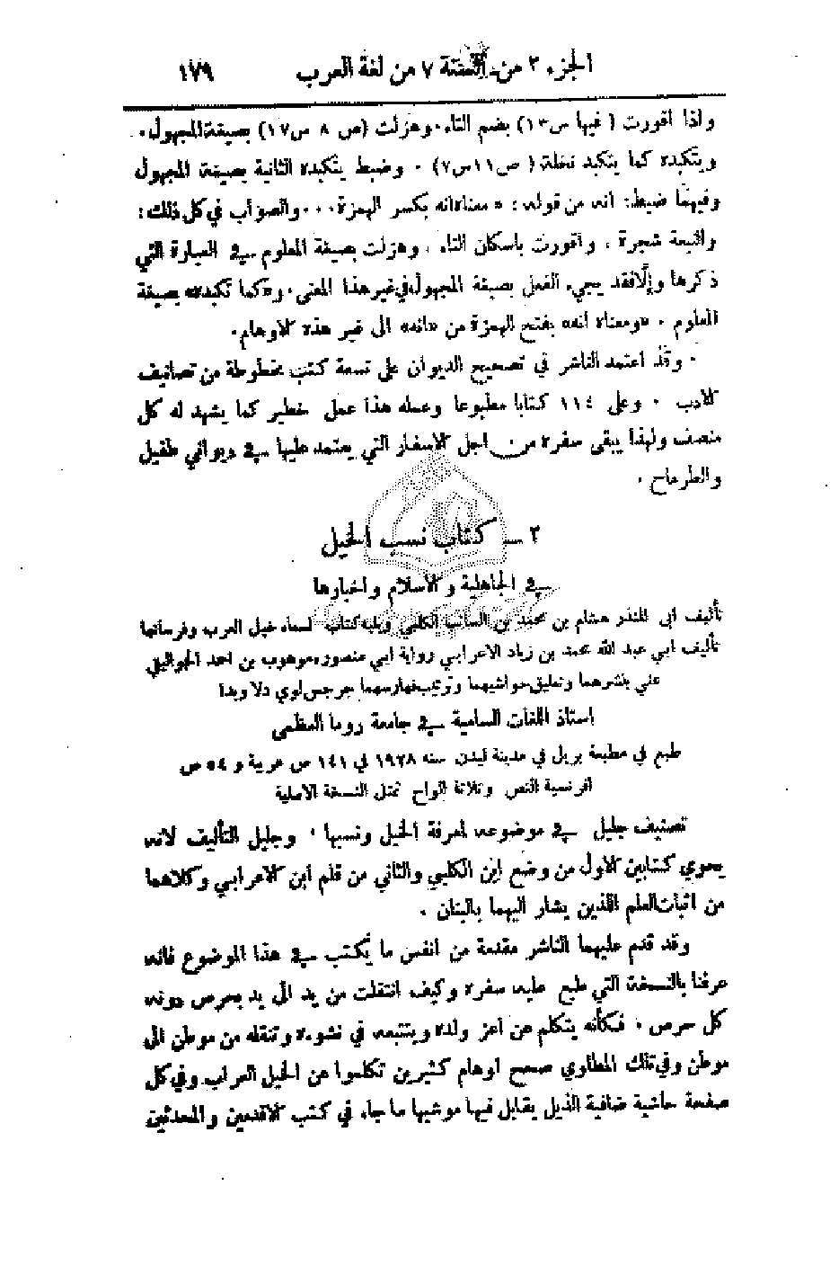 وقد قدم عليهما الناشر مقدمة من انفس ما يكتب في هذا الموضوع فأنه عرفنا بالنسخة التي طبع عليه سفره وكيف انتقلت من يد إلى يد بحرص دونه كل حرص. فكأنه يتكلم عن أعز ولده ويتتبعه في نشوءه وتنقله من موطن إلى موطن وفي تلك المطاوي صحح أوهام كثيرين تكلموا عن الخيل العراب وفي كل صفحة حاشية ضافية الذيل يقابل فيها موشيها ما جاء في كتب الأقدمين والمحدثين