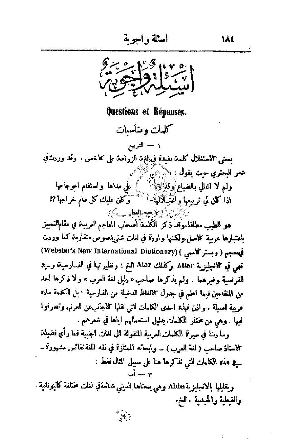 ومادمنا في سيرة الكلمات العربية المنقولة إلى لغات أجنبية فما رأي فضيلة الأستاذ صاحب (لغة العرب) - وأبحاثه الممتازة في فقه اللغة نفائس مشهورة - في هذه الكلمات التي نذكرها هنا على سبيل المثال فقط: