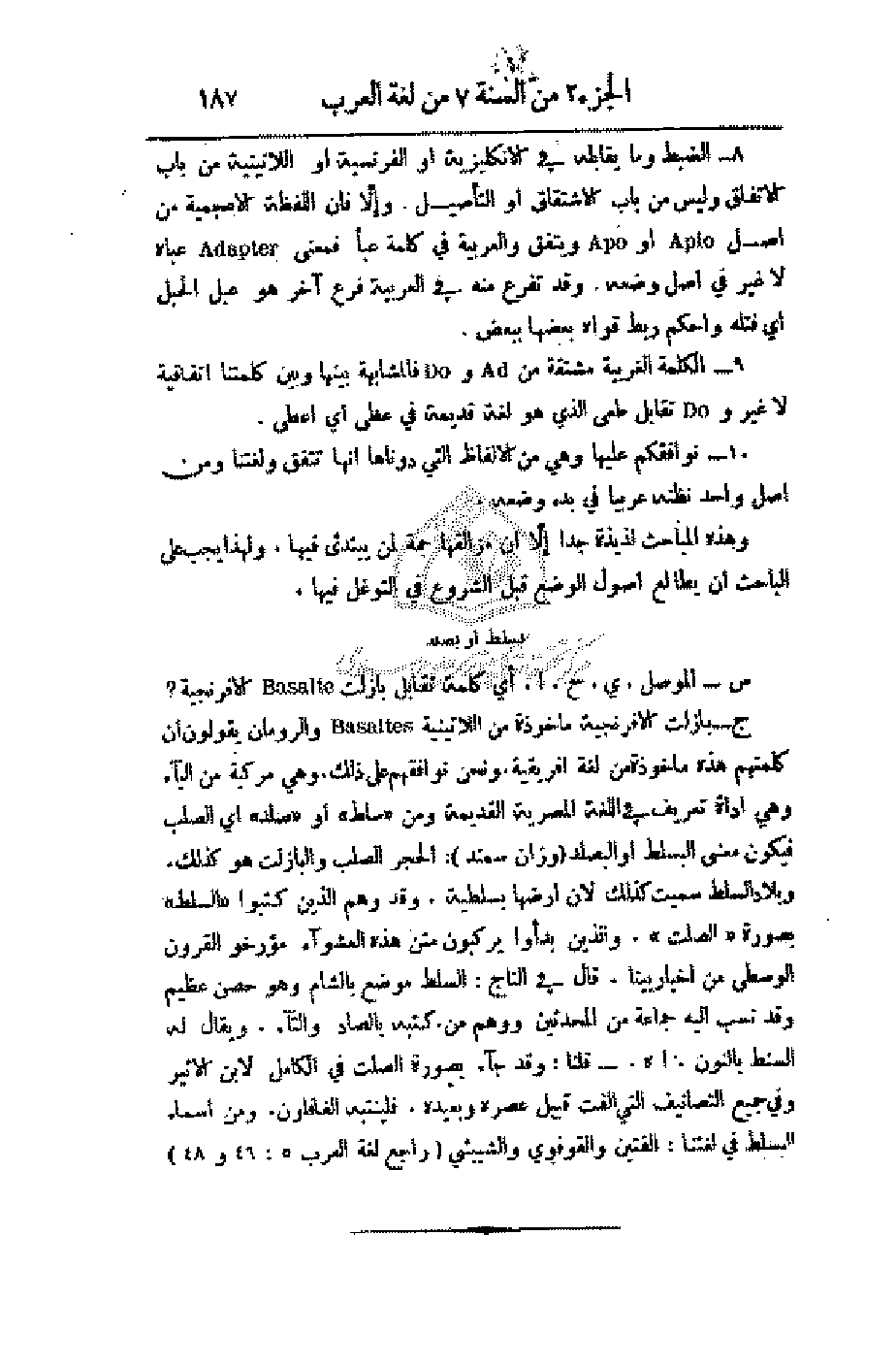 ج - بازلت الإفرنجية مأخوذة من اللاتينية والرومان يقولون إن كلمتهم هذه مأخوذة من لغة أفريقية. ونحن نوافقهم على ذلك. وهي مركبة من الباء وهي أداة تعريف في اللغة المصرية القديمة ومن (سلط) أو (صلد) أي الصلب فيكون معنى البسلط أو البصلد (وزان سمند): الحجر الصلب والبازلت هو كذلك. وبلاد السلط سميت كذلك لأن أرضها بسلطية. وقد وهم الذين كتبوا (السلط) بصورة (الصلت). والذين بدءوا يركبون متن هذه العشواء مؤرخو القرون الوسطى من أخباريينا. قال في التاج: السلط موضوع بالشام وهو حصن عظيم وقد نسب إليه جماعة من المحدثين ووهم من كتبه بالصاد والتاء. ويقال له السنط بالنون. اهـ. - قلنا: وقد جاء بصورة الصلت في الكامل لابن الأثير وفي جميع التصانيف التي ألفت قبيل عصره وبعيده. فلينتبه الغافلون. ومن أسماء البسلط في لغتنا: الفتين والقوفوي والشبيثي (راجع لغة العرب 46: 5 و48)