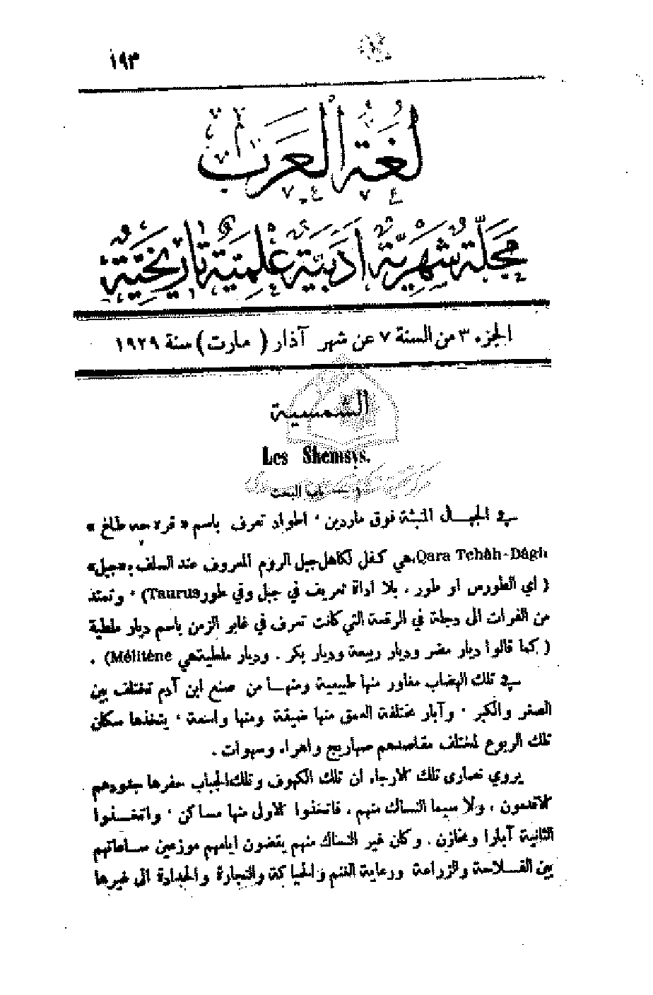 في الجبال المنبثة فوق ماردين، أطواد تعرف باسم (قره جه طاغ) - هي كفل لكاهل جبل الروم المعروف عند السلف ب (جبل) (أي الطورس أو طور، بلا أداة تعرف في جبل وفي وتمتد من الفرات إلى دجلة في الرقعة التي كانت تعرف في غابر الزمن باسم ديار ملطية (كما قالوا ديار مضر وديار ربيعة وديار بكر. وديار ملطية هي